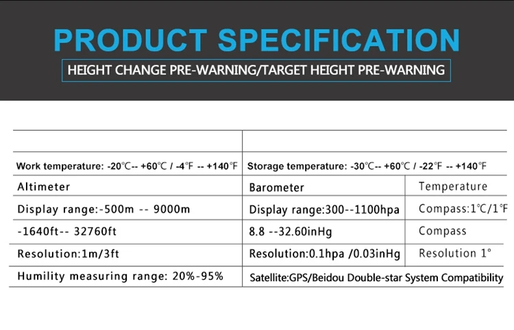 1. GPS и Beidou двойная система совместимы, функция двойного позиционирования, скорость, расстояние, 9 наборов записей возврата/возврата2. Высота прибыль/убыток, 24-часовое испытание в историческом данные о высоте/запись кривой3. Интервал изменения высоты, может быть установлен от 1 до 200 метров4. Настройки напоминания о высоте5. История высокой/низкой высоты, температуры и влажности записей6. Атмосферного давления за 24 часа отображения кривой7. 16 с двойным направлением электронный компас функция8. Температура, влажность, время, дата, будильник, функция фонарика9. Встроенная перезаряжаемая литиевая батарея10. Водонепроницаемость IPX4