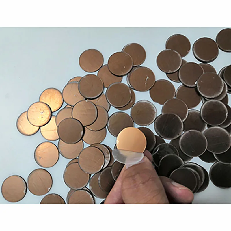 Зеркальный пластик, в 1 мм толщиной. 2 см в диаметре. Что соответствует описанию. С одной стороны липкая основа под белой бумагой. Под прозрачной пленкой само зеркальное покрытие. Насколько хорошо будет держать клей, пока не знаю. Но пока поотдеру все защитные плёнки наверное чтобы не залапать поверхности, одену перчатки. В пакетике было 116 шт. Все целые. Что оказалось приятной неожиданностью как в плане колличества так и целостности товара.