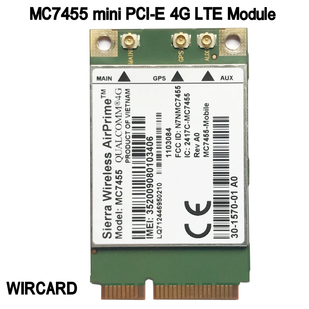 MC7455Мини-карта PCI Express-это компактный, легкий, беспроводной модем на базе LTE-Advanced и UMTS. Она обеспечивает подключение LTE-FDD, LTE-TDD, DC-HSPA +, HSPA +, HSDPA, HSUPA, WCDMA и GNSS для сетевых приложений и приложений M2M в нескольких диапазонах радиочастот и поддерживает роуминг 3G.MC7455Является модулем 4G LTE cat.6 (FDD & TDD), со скоростью передачи данных вниз до 300 Мбит/с, в основном для Европы, Северной и Южной Америки. Поддержка агрегирования несущих устройств (CA) и MIMO. Возвращайтесь к 3G DC-HSPA + с разнообразием Rx. У него есть модель brotherСиерра MC7430Который также является сотовым модулем LTE с категорией 6.