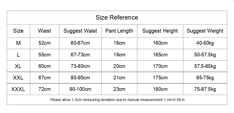 Азиатский размер отличается от американского или Европейского размера.(Пожалуйста, ознакомьтесь с таблицей размеров перед покупкой)Размер: M, Талия: 52 см, Рекомендуемая Талия: 60-67 см,Размер: L, Талия: 55 см, Рекомендуемая талия: 67-73 см,Размер: XL, Талия: 60 см, Рекомендуемая Талия: 73-80 см,Размер: XXL, талия: 67 см, Рекомендуемая Талия: 80-90 см,Размер: XXXL, талия: 72 см, Рекомендуемая талия: 90-100 см,