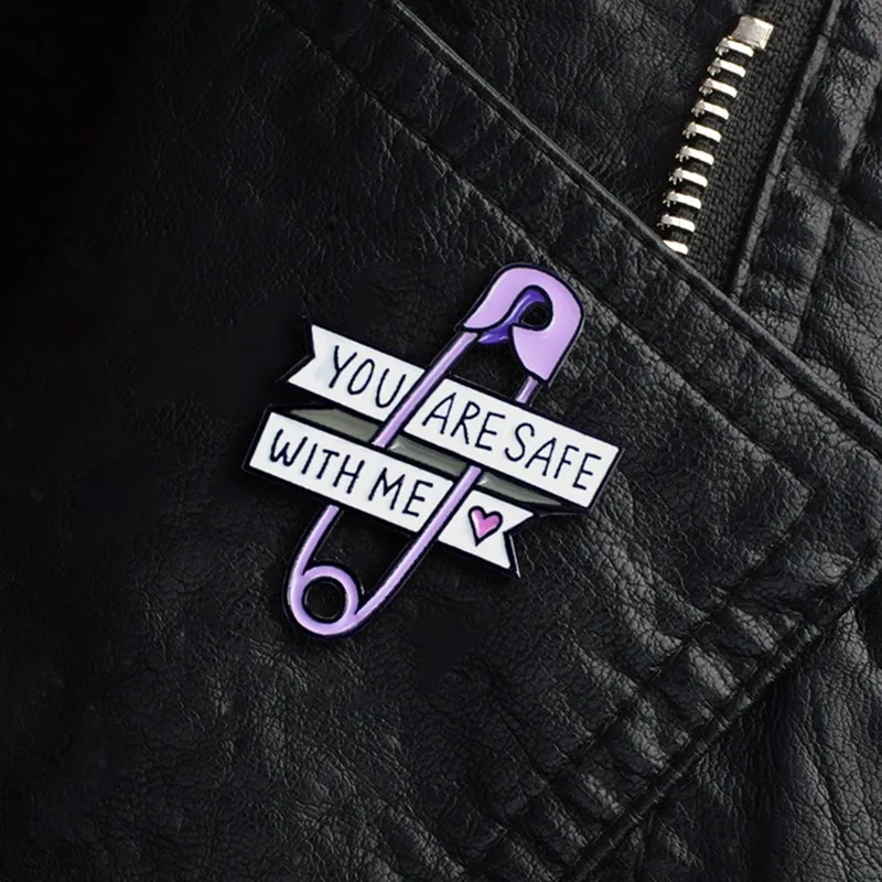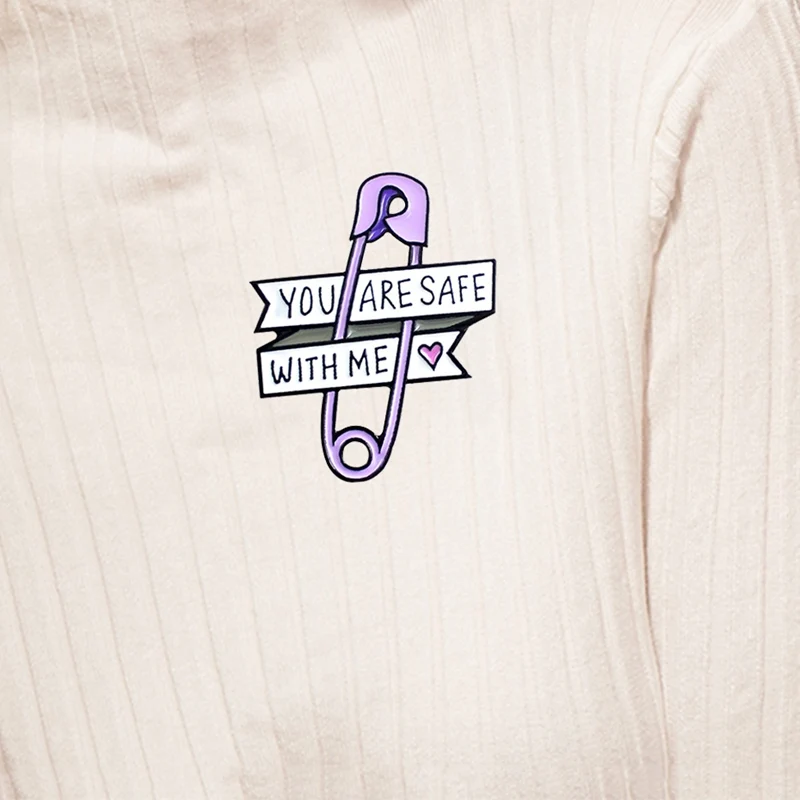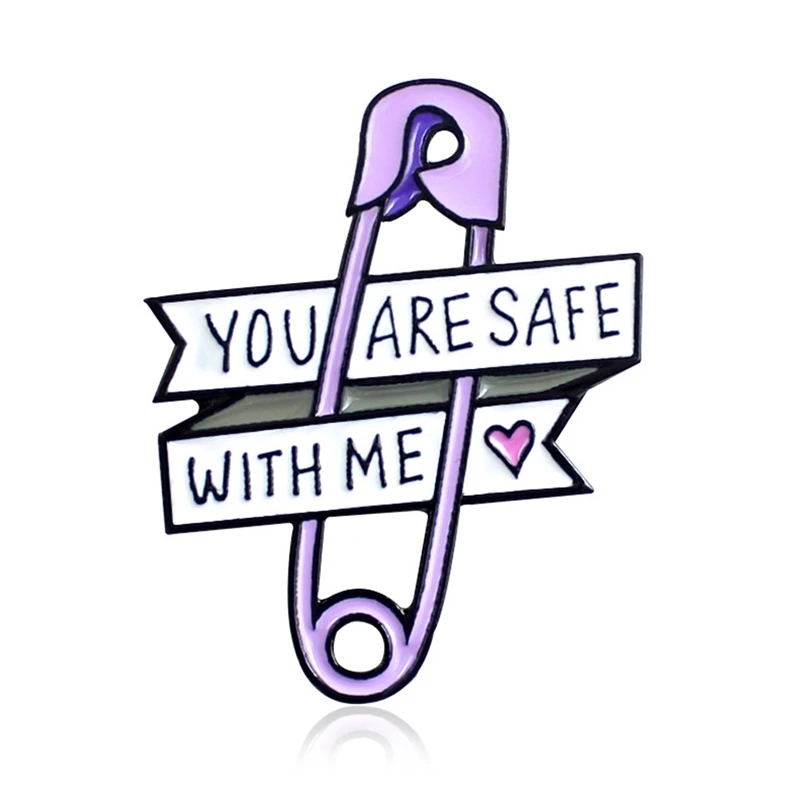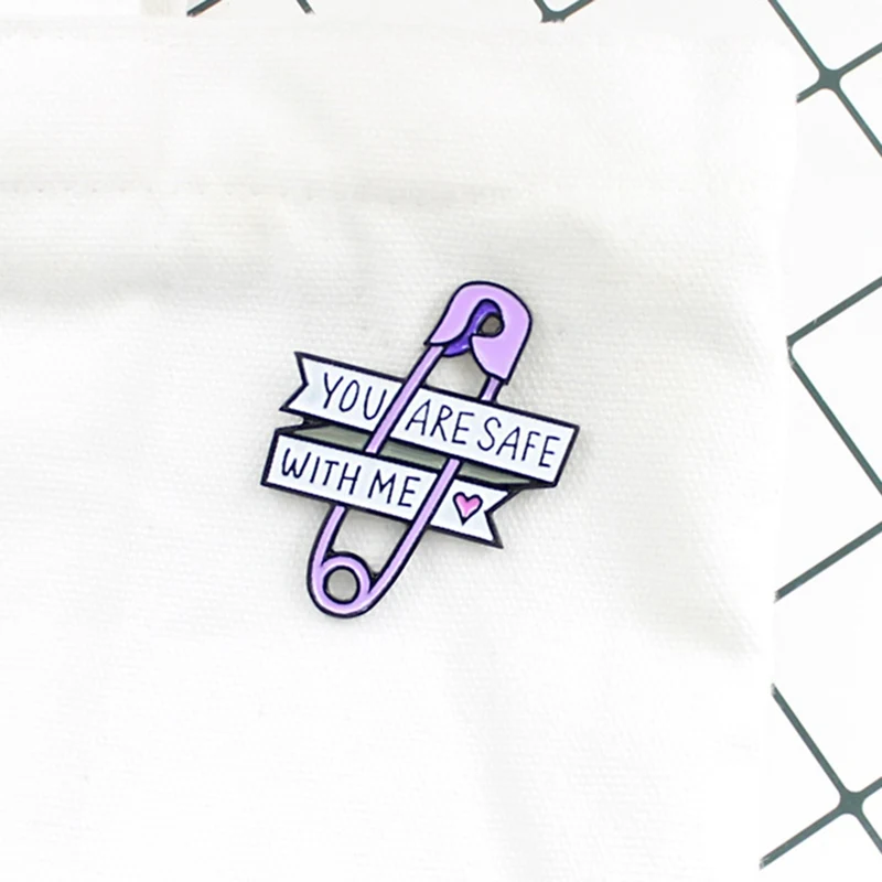 Новинка, брошь в виде ленты с надписью Love, фиолетового цвета, с зажимом You Are Safe With Me, эмалированная булавка значок для рюкзака, подарки для друзей, детей, семьи