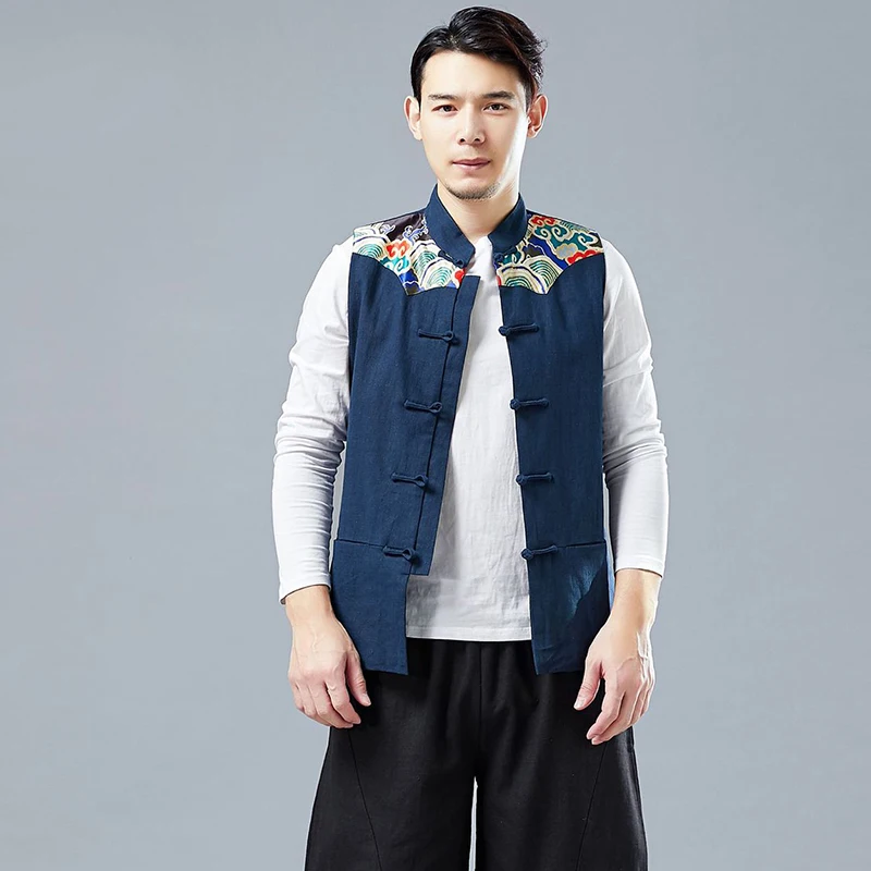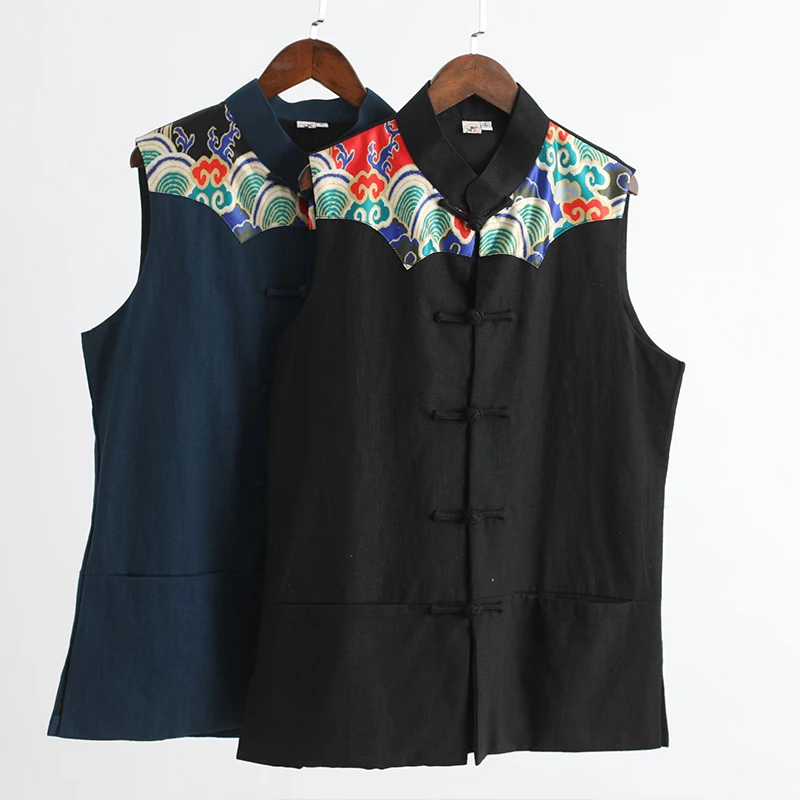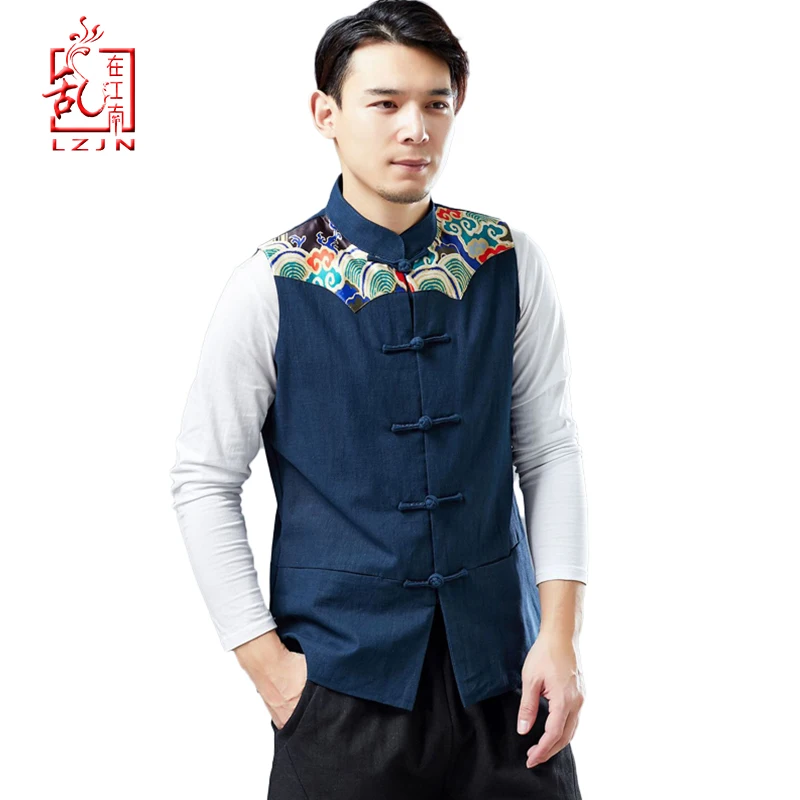 LZJN 2019 мужской летний жилет стильный принт в китайском стиле Лоскутная льняная рубашка на пуговицах кунг-фу без рукавов жилет куртка
