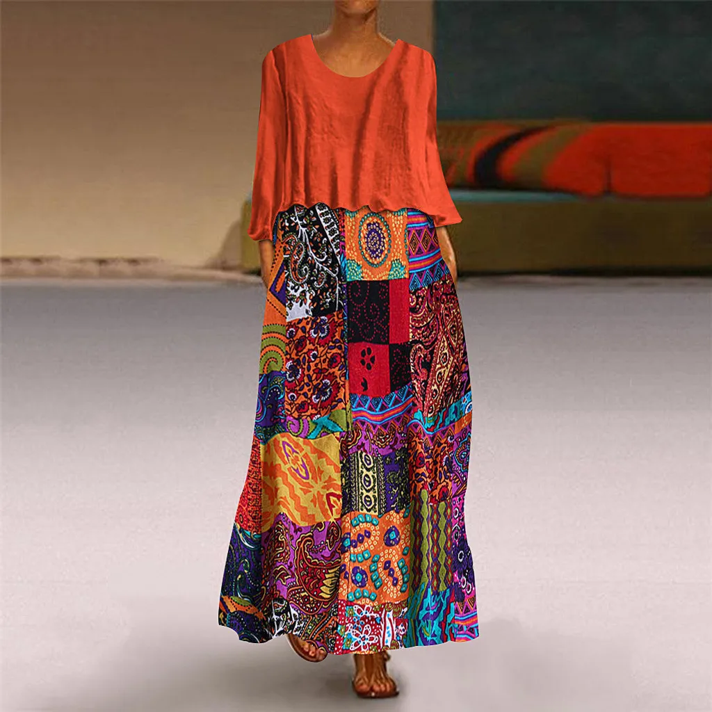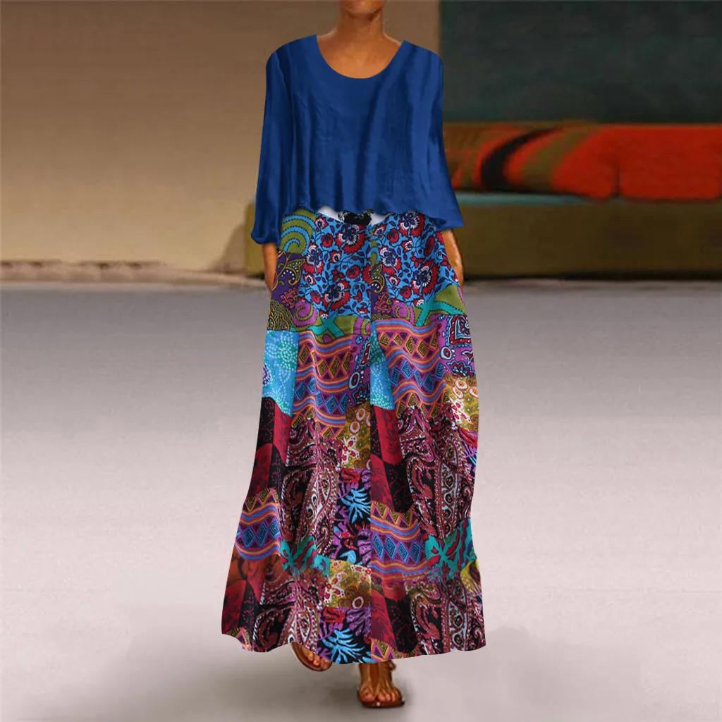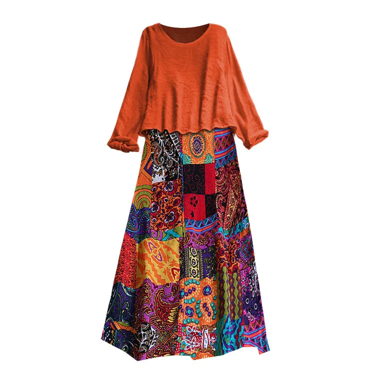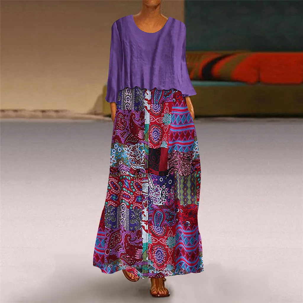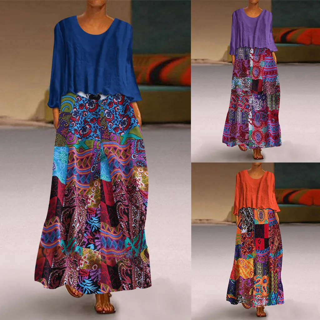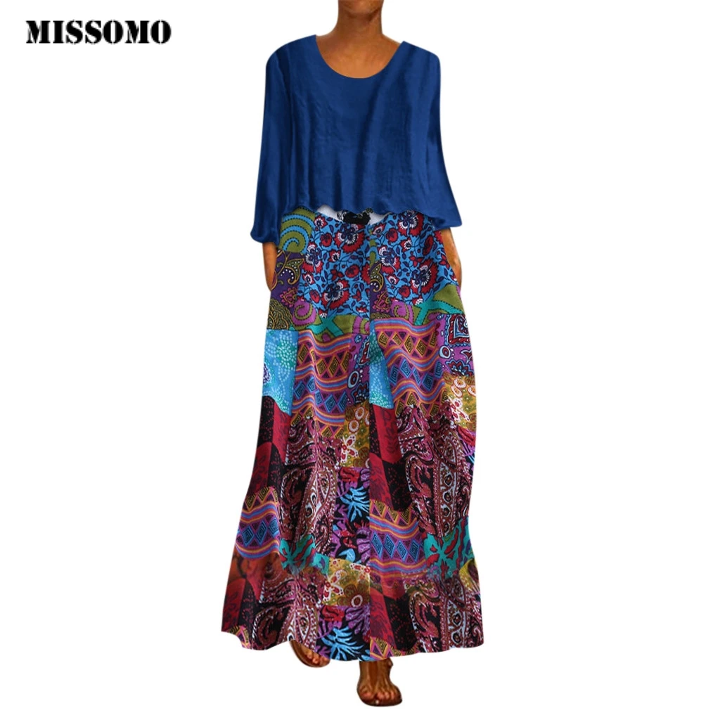 Женское платье-макси MISSOMO, винтажное платье из двух частей с этническим принтом размера плюс, свободное летнее платье с длинным рукавом и круглым вырезом, 2019