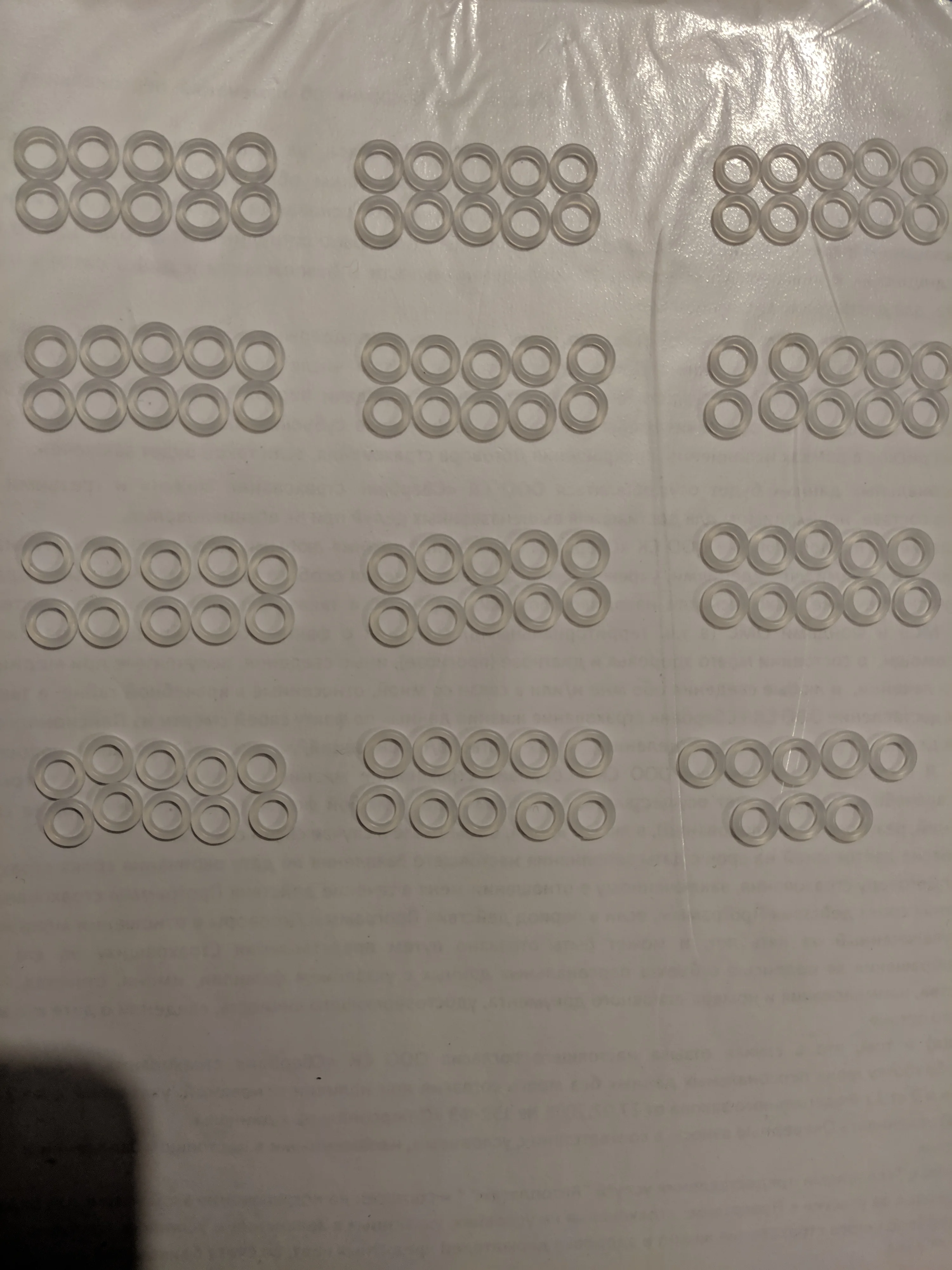 Доставка 15 дней до Вологды, от оплаты до получения. Упаковано нормально, пришло целым. Получил 2 пакетика колец (119 + 118) из них 2 шт были порваны, итого получил 235 шт. Заказывал для "HAVIT 432 Red RU", клавиатура стала тише, исчез звук удара, сейчас звук стал более глухим, особо тихой клавиатура не стала, но уже звук гораздо ближе к мембранной клавиатуре. Одевал по 2 кольца, ход клавиш тоже уменьшился. Сами клавиши работают нормально, чувствуется небольшая желейность при полном нажатии. В целом я доволен результатом.