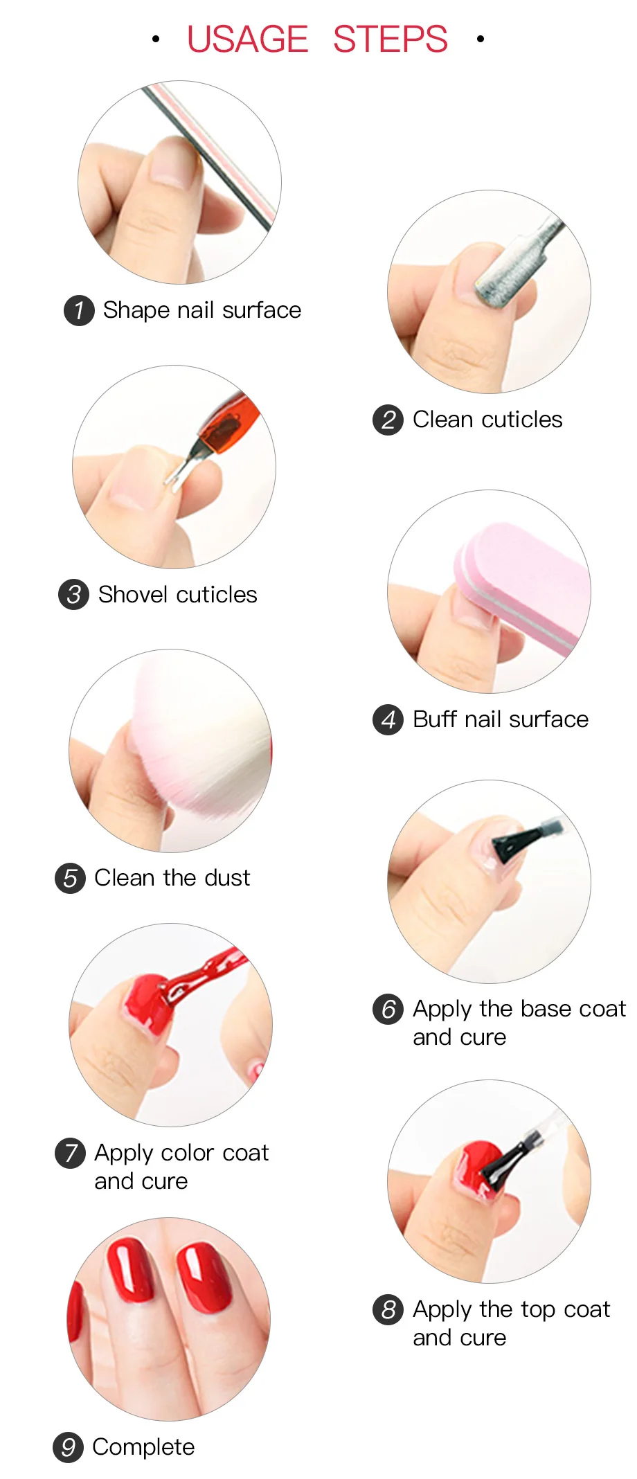 1. Форма ногтя. Слегка полируйте поверхность ногтевой пластины. Продезинфицируйте. -2. Нанесите базовый слой основы от кутикулы до свободного края (не забудьте запечатать край ногтя). Высушите ногти под светодиодный светильник в течение 10 секунд или УФ-светильник в течение 2 минут. -3. Нанесите тонкое пальто замочить Off гель Лак Цвет на выбор. Крышка без края. Лечение: светодиодный светильник 30 секунд, или 2 минуты в УФ-лампе. -4. Повторите 2nd тонкое пальто из удалять замачиванием Гелевый лак для ногтей. Высушите под светодиодный лампой в течение 30 секунд или УФ-светильник в течение 2 минут. -5. Нанесите верхнее пальто. Крышка без края. Лечение: светодиодный светильник 30 секунд. -6. Удалите липкие остатки на ногтях с помощью очищающего средства. Затем нанесите питающее Масло для кутикулы, чтобы увлажнить кутикулу и кожу вокруг ногтя.