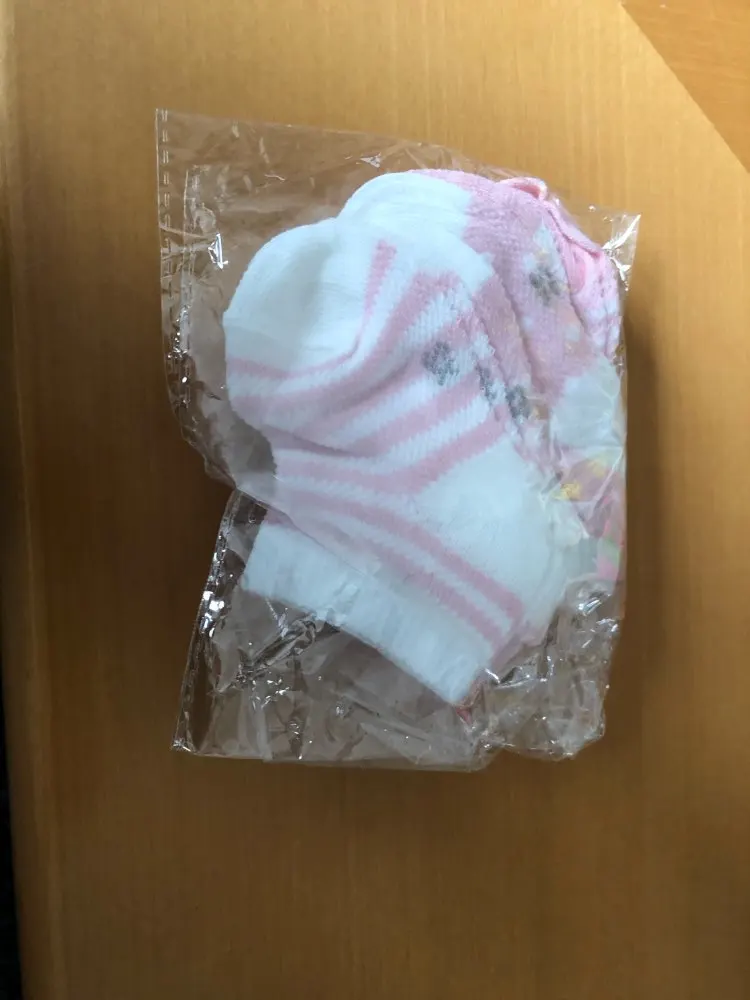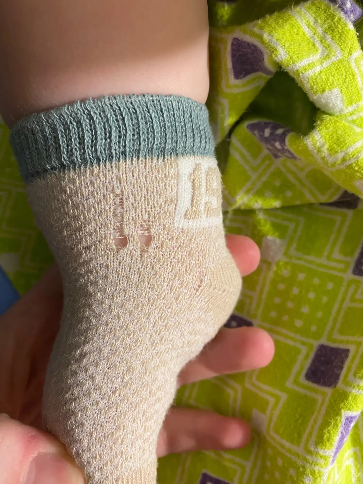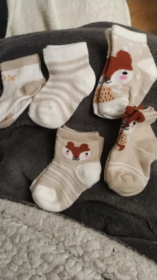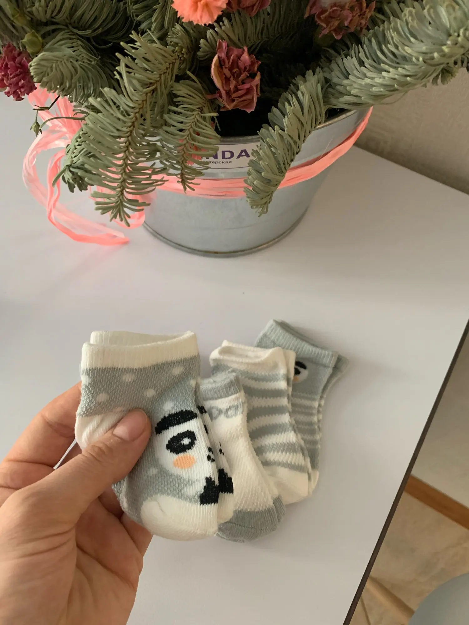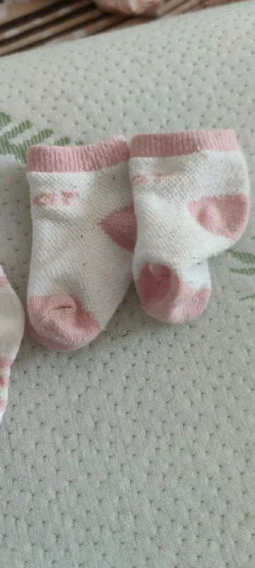 Симпатичные тоненькие носочки. Не на новорожденного точно, месяца на 4-5 думаю. Не 100% хлопок, слегка «скользкие». Доставка 2 месяца