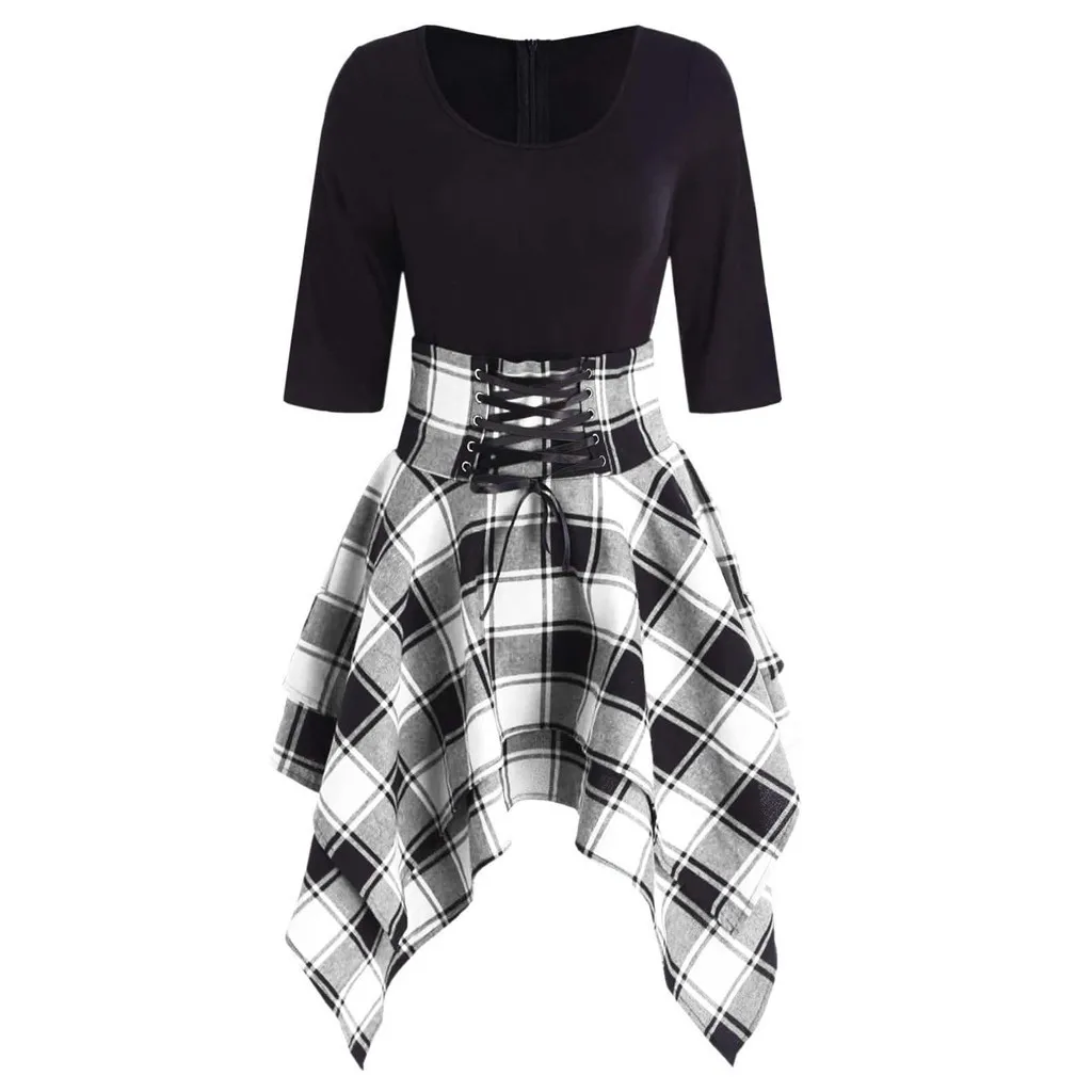 Женское платье трапециевидной формы, повседневное клетчатое платье в клетку, на шнуровке, с круглым вырезом, большие размеры, 2019