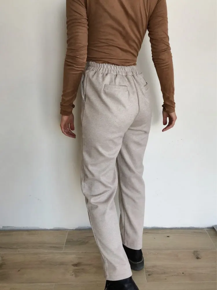 Описание брюк соответствуют действительности.Ткань очень приятная мягкая ,цвет бежевый красивый.Как оказались тепленькие.Размер на 44 взяла L,прям на прогадала.Швы кривые внизу,карман один не прошит.За такие деньги буду носить.