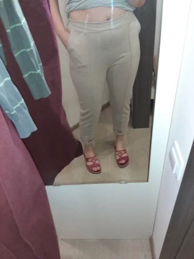 Брюки хорошие, очень плотная и приятная ткань, они реально тёплые. Почти в точности соответствуют размерной сетке и промофото. Цвет красивый. Но.. по размеру и посадке немного не то, что я хотела. На мои честные 97см ОБ выбрала L и они прям по размеру получились, а я хотела посвободнее. Так что если нужно как на модели - смело берите на 2-3 размера больше. На талии у них плотная хорошая резинка, она будет держаться и на ОТ меньше, чем заявлено в таблице продавца. Например, в моей L талия в нерастянутом виде - 62 см, при этом на мои 69 сидит плотно, но не давит. Ну и реальные их замеры ПОБ - 49, ПОТ - 31, ширина штанины вверху - 26, длина штанины по внутреннему шву - 67см