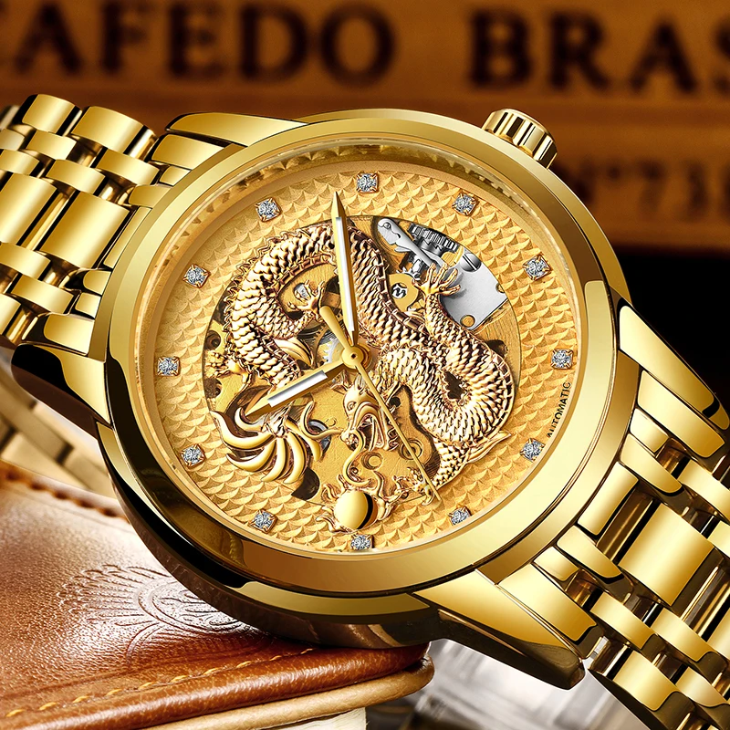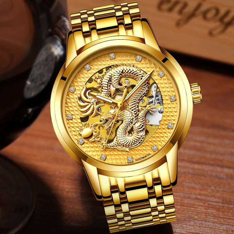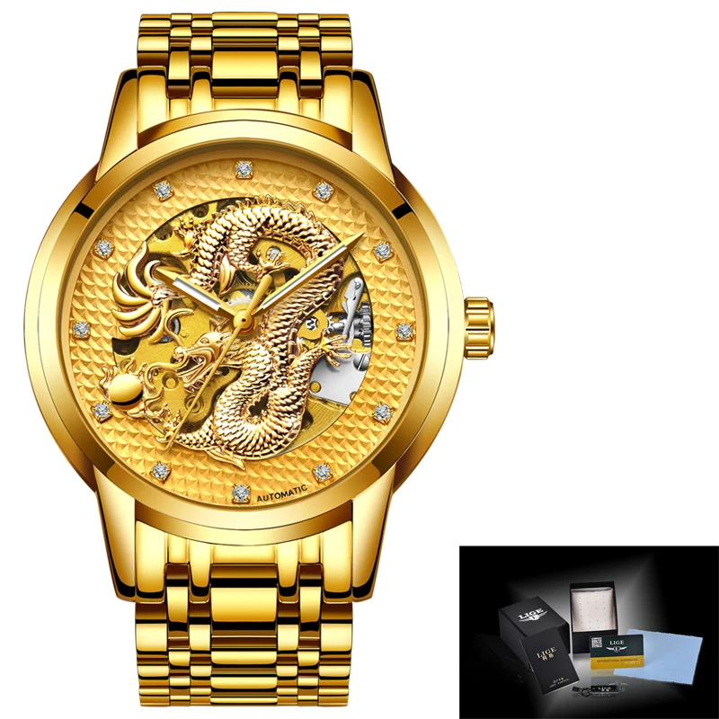 Часы мужские с автоподзаводом, водонепроницаемые, из нержавеющей стали, с коробкой, мужские часы с драконом
