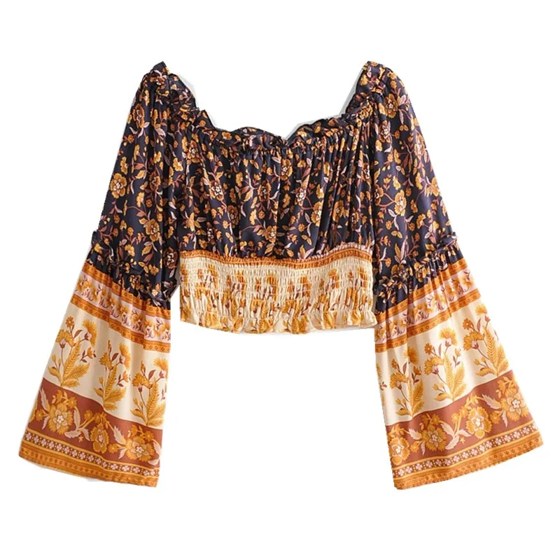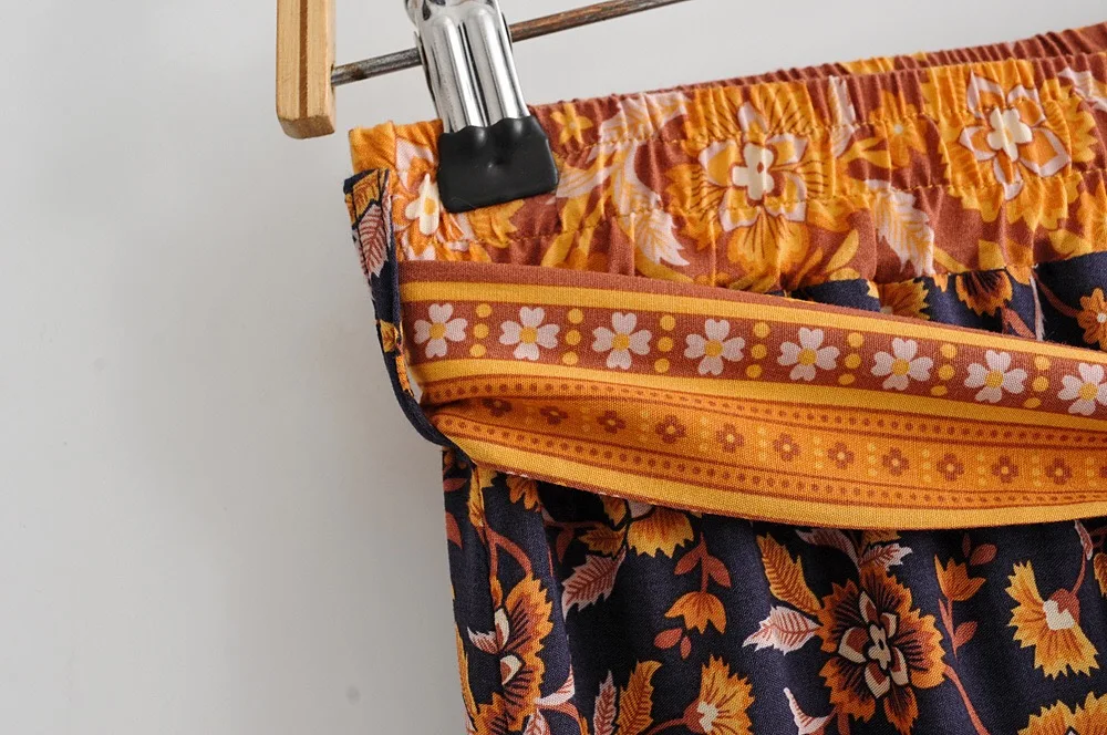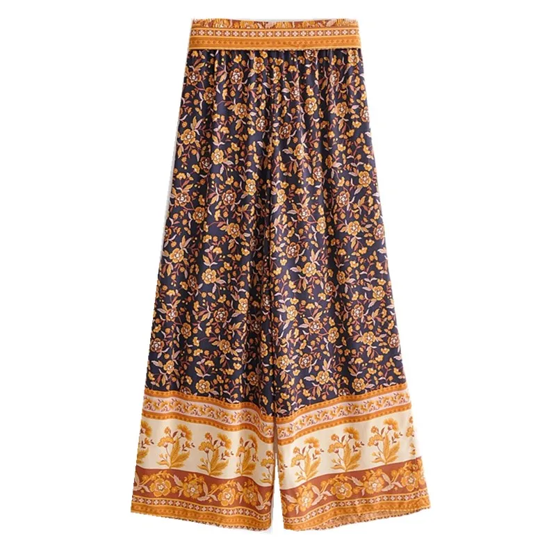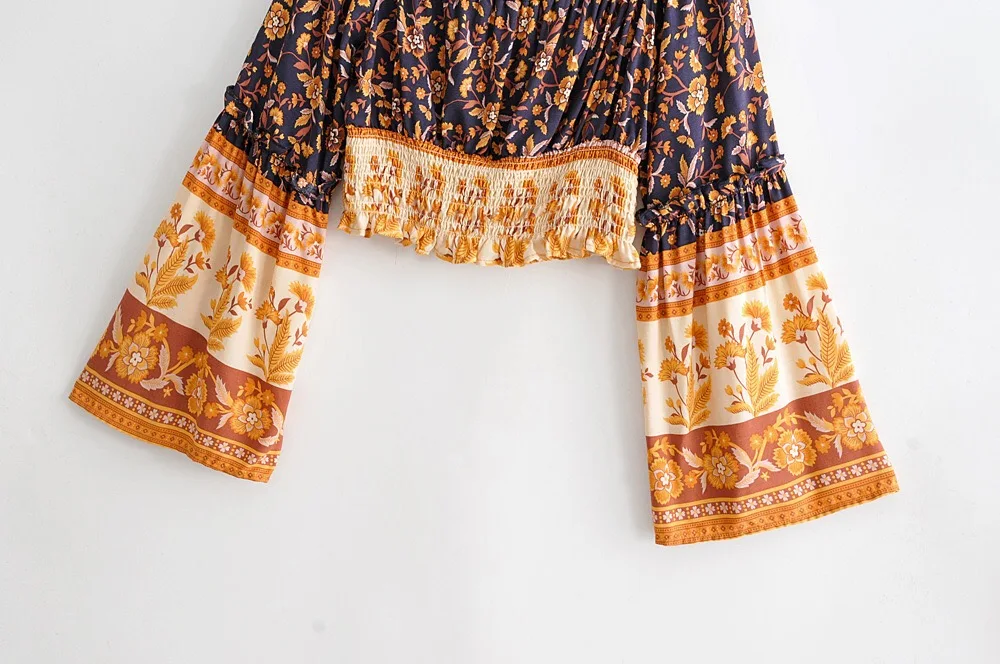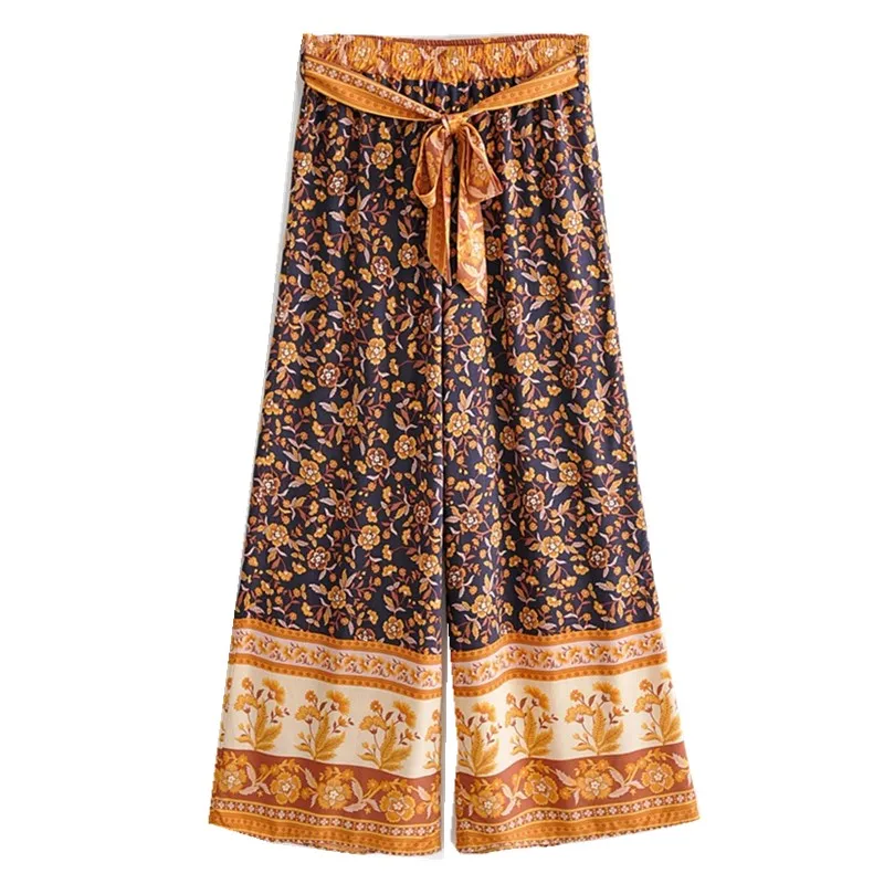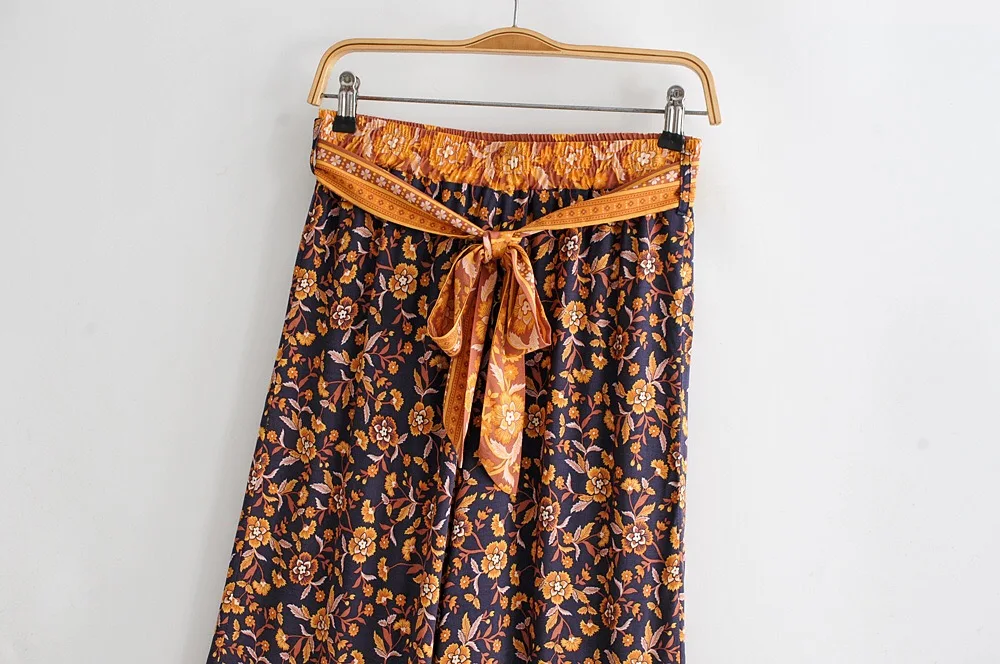 Новый богемный Ruched эластичный Slash шеи цветочный принт пуловер рубашка коричневый 2019 женский Tide лук эластичный пояс брюки комплект из 2 предметов
