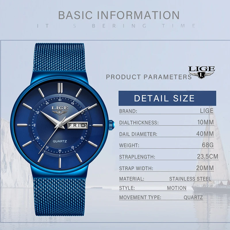 Часы наручные LIGE Мужские кварцевые, брендовые Роскошные простые водонепроницаемые полностью стальные, синие, 2019