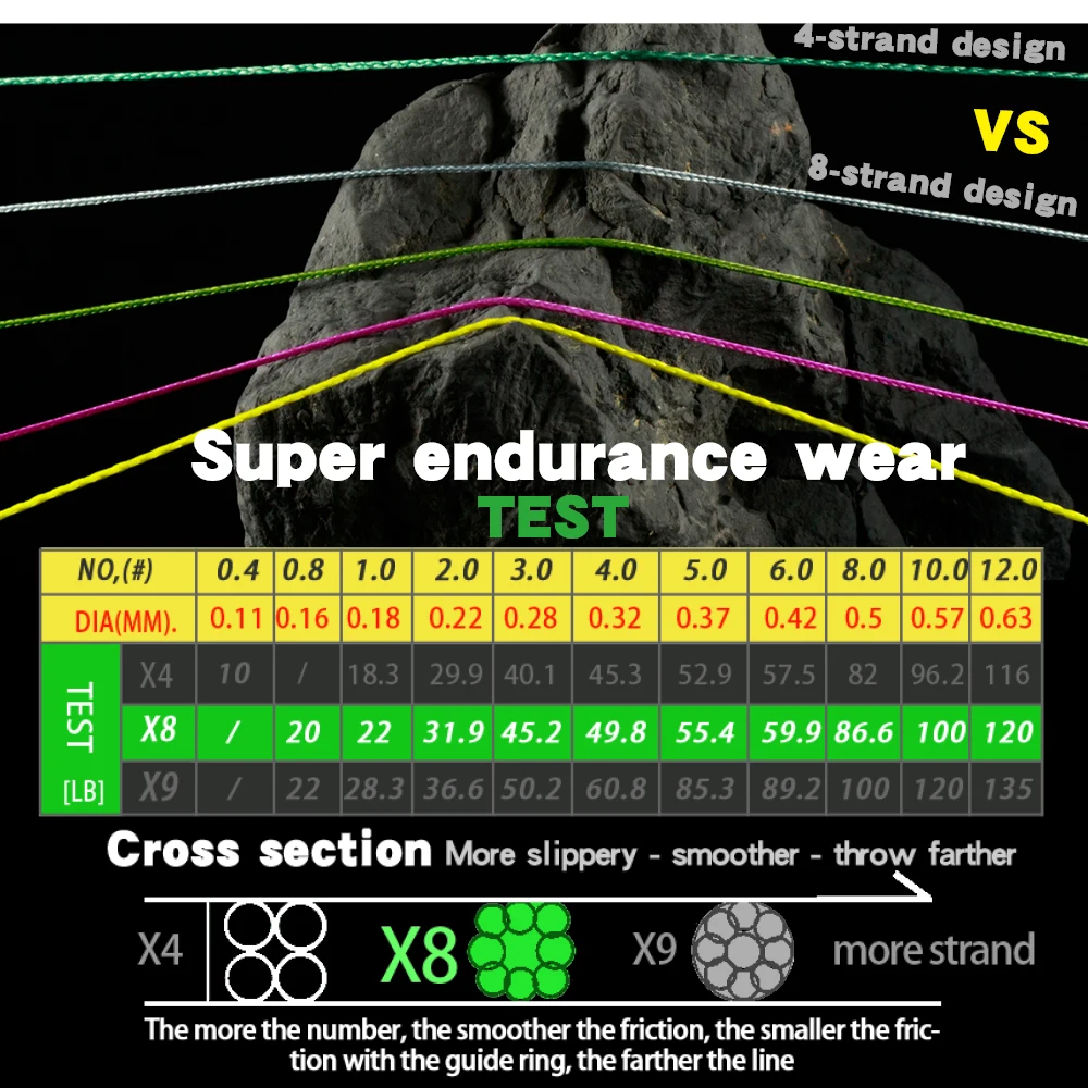 Х8 5.0# плетёный шнур на вид замечательный; гладкий, прочный на разрыв( поднял гирю 24кг.,дергал но порвать несмог).Я доволен. Продавца рекомендую, быстро, точно и в срок.