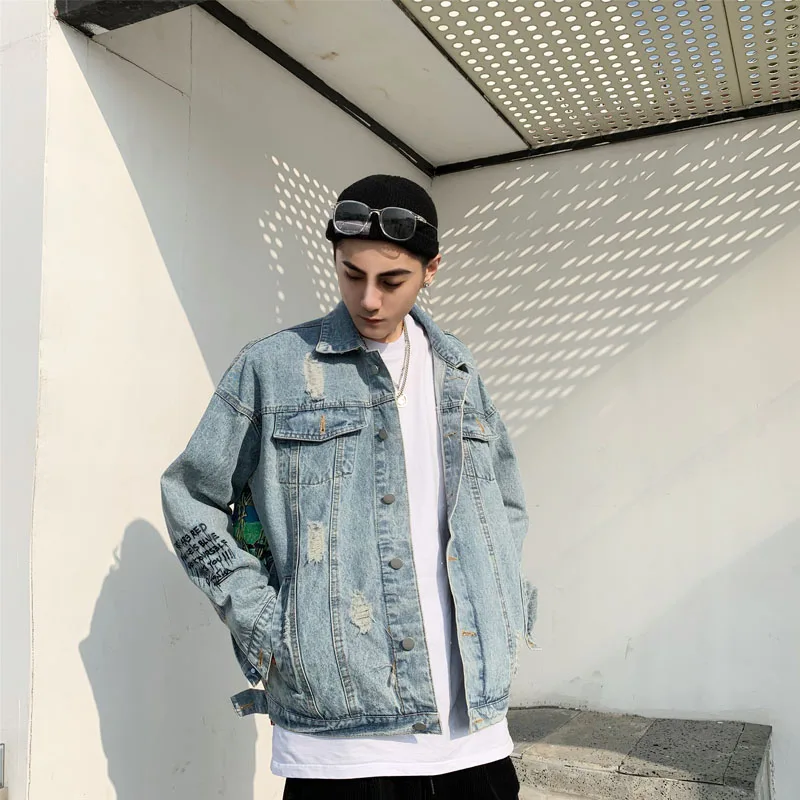 Мужская джинсовая куртка, потертая повседневная куртка в стиле хип-хоп, с принтом в виде маленького демона и граффити, свободная верхняя одежда, осень 2021