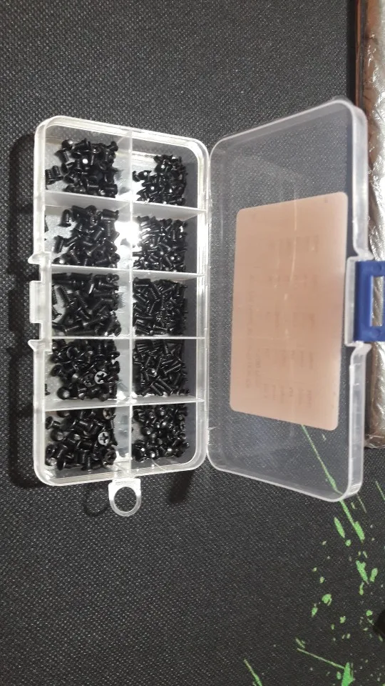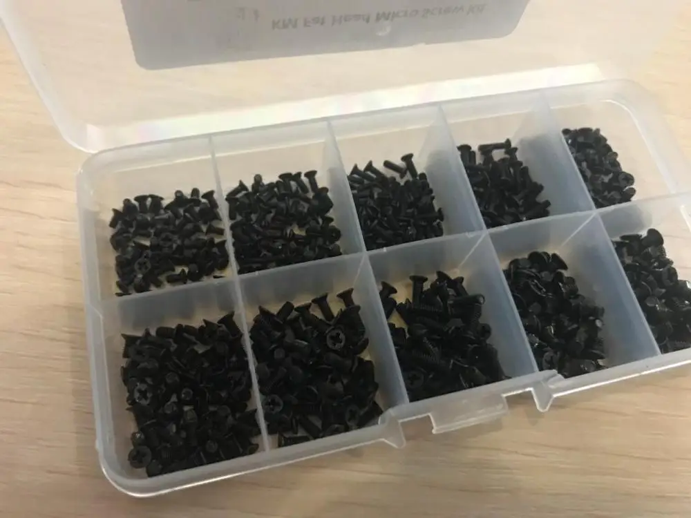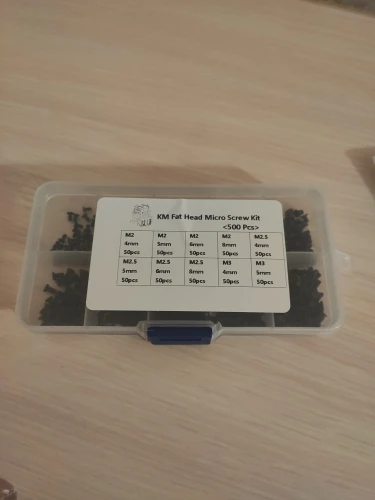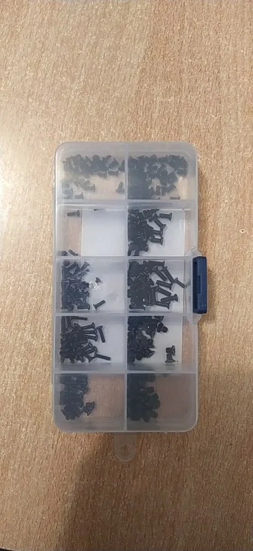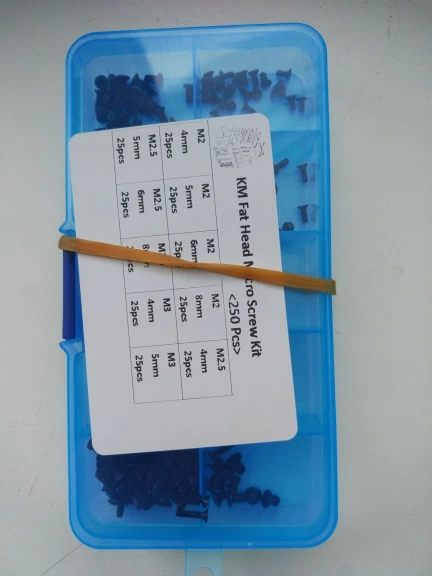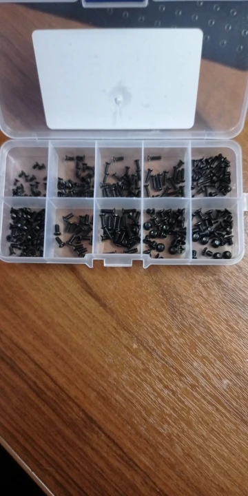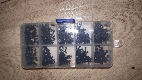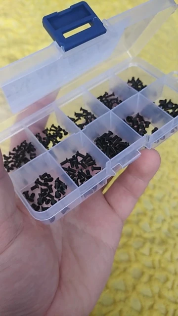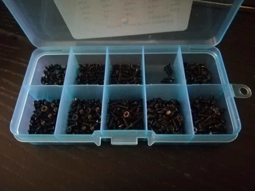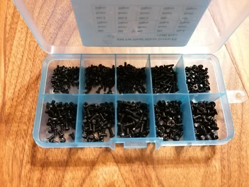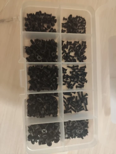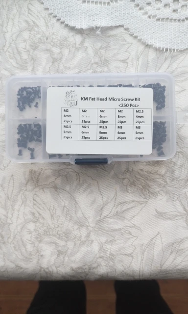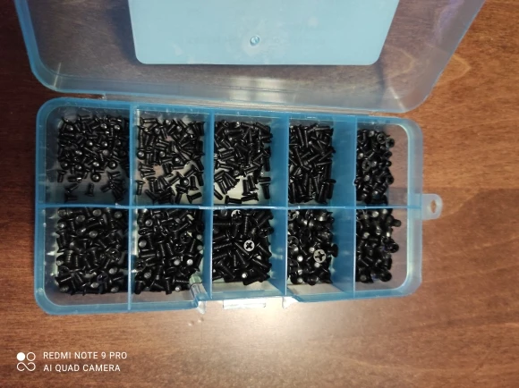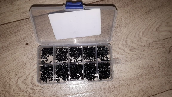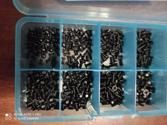 Винты супер! Продавец не поскупился, положил каждого размера не по 25 шт, а на несколько штук больше. А вот крышка коробочки хлипкая. Винты, что поменьше, могут перемещаться по ячейкам, если коробочку переворачивать. Но это не критично.