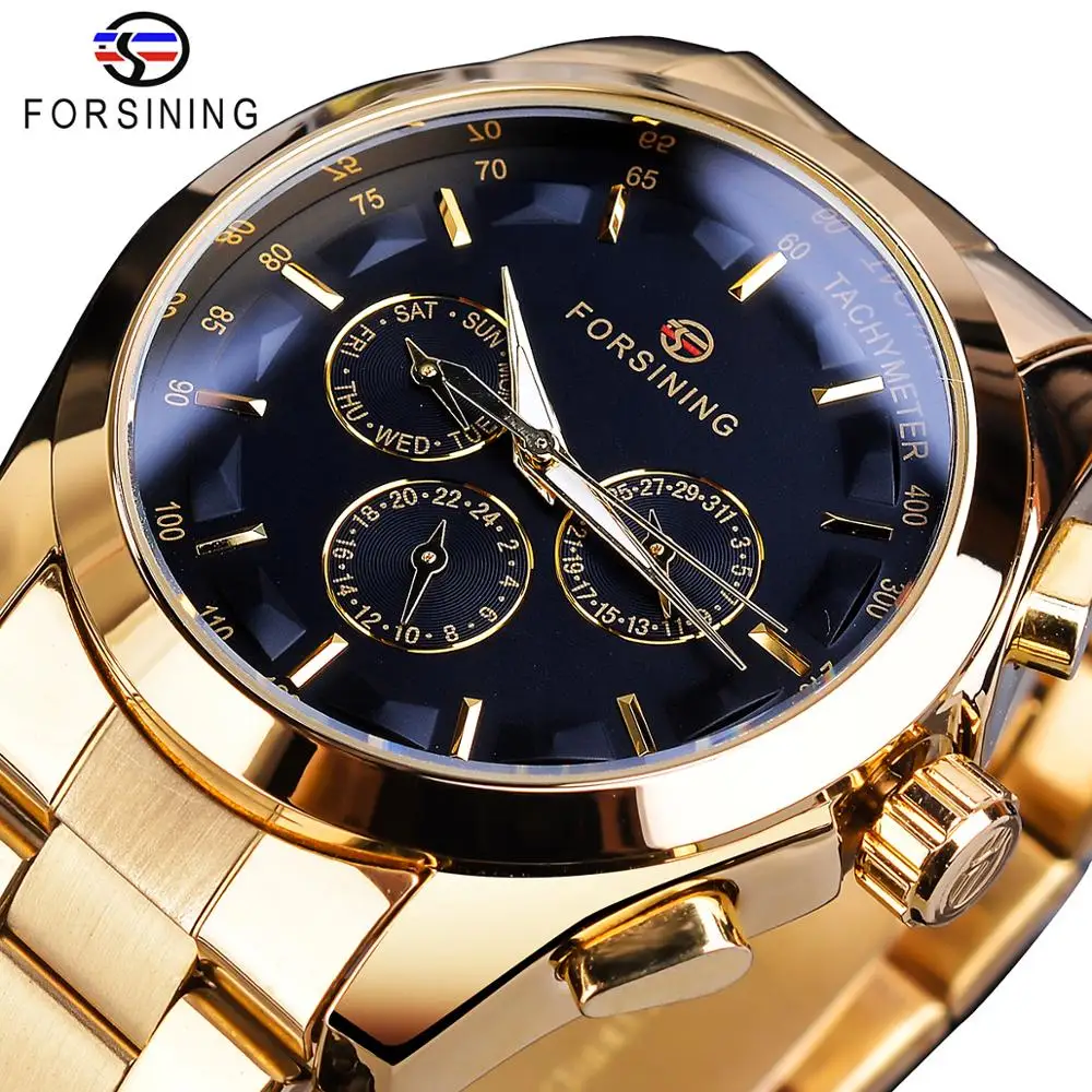 Часы наручные Forsining Мужские механические, деловые автоматические золотистые Стальные наручные, с 3 дополнительными циферблатами, с датой