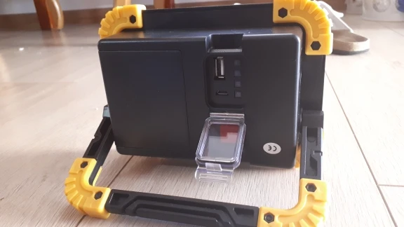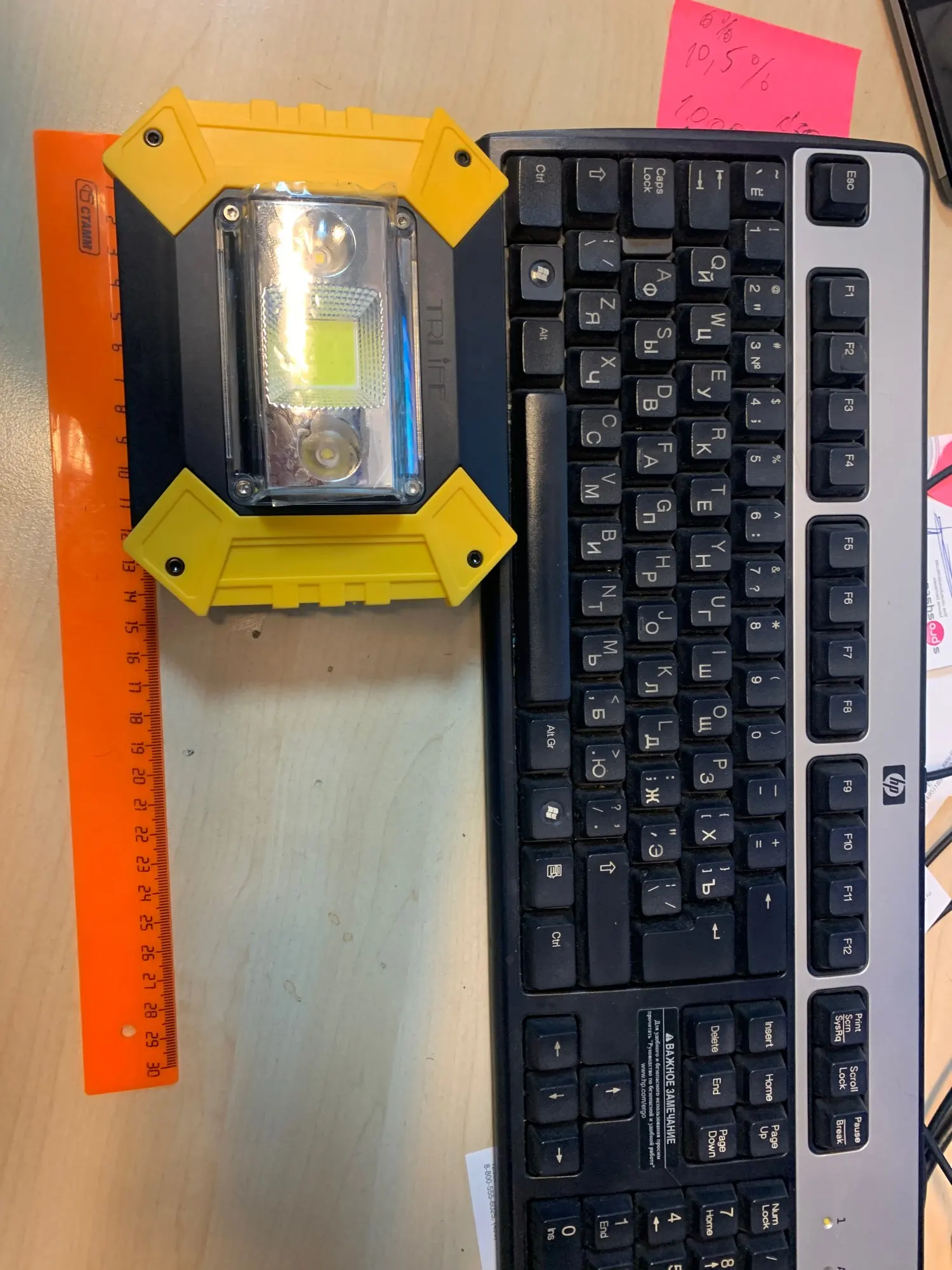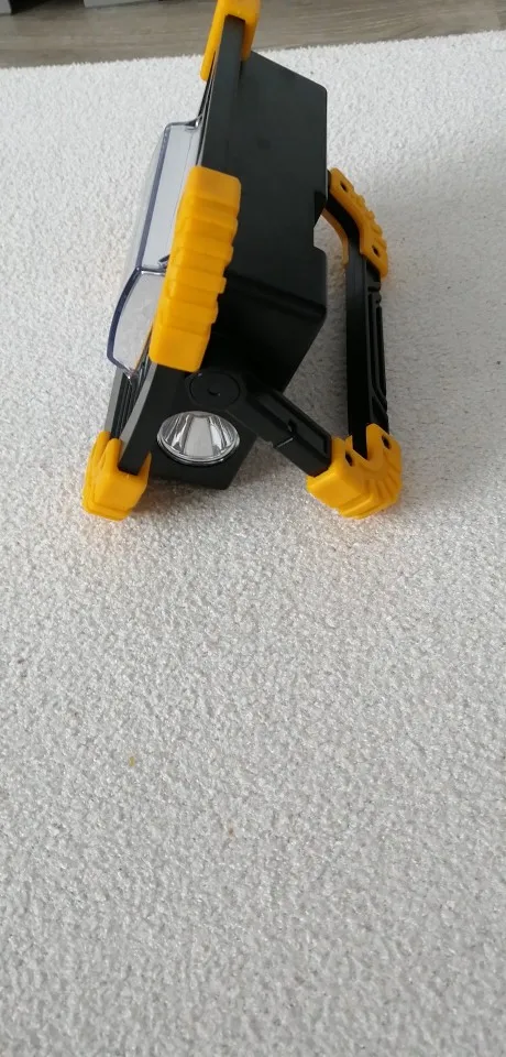 Доставка 5 дней. Материал пластик. Круглые линзы имеют большую выпуклость, поэтому более рассеиваются. По яркости можно сравнить с лампой 40-60 Вт. Боковой одиночный диод более яркий за счет узкого луча - удобен для дали. Ручки имеет фиксацию в 5 положениях для разно угла наклона. В описании не указано, что может работать от сети за счет зарядного от телефона, подключаемого в гнездо мини USB на тыльной стороне фонаря.