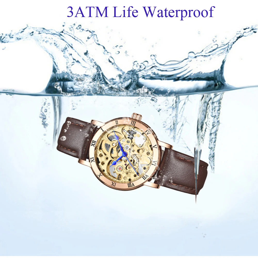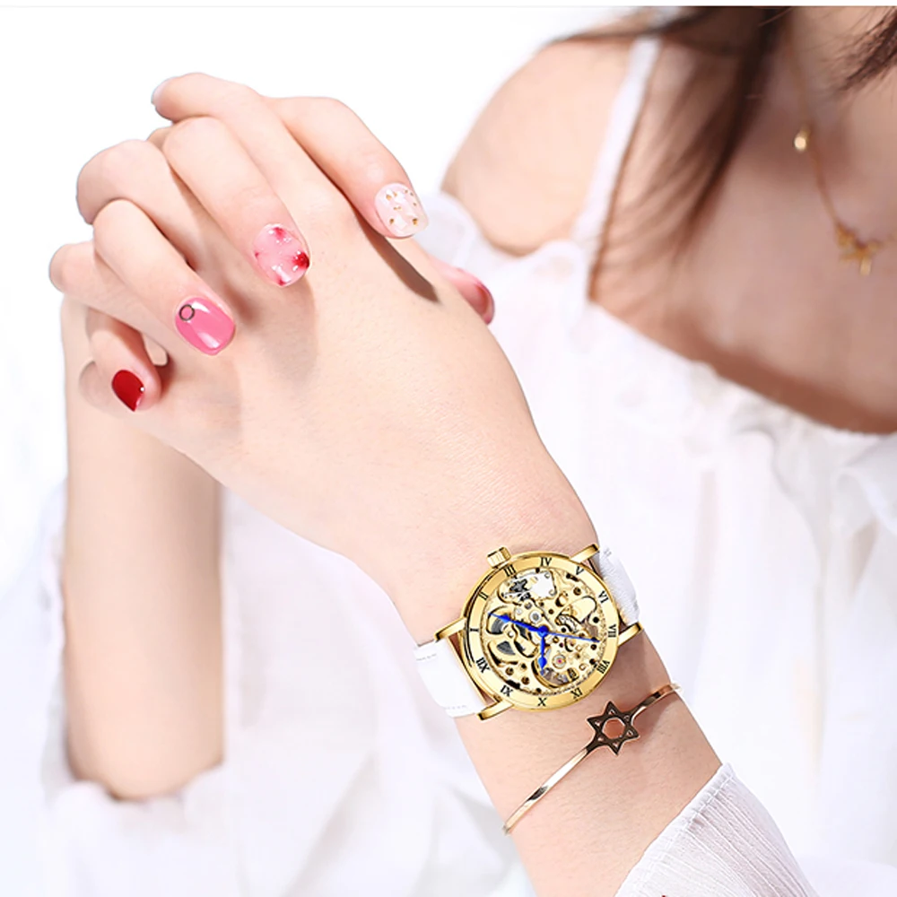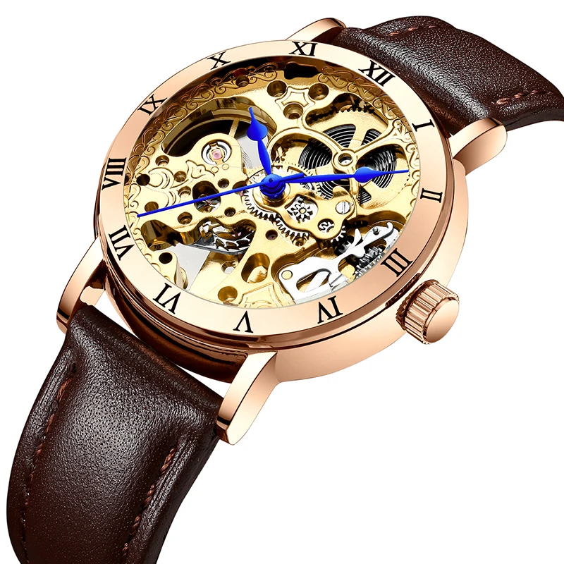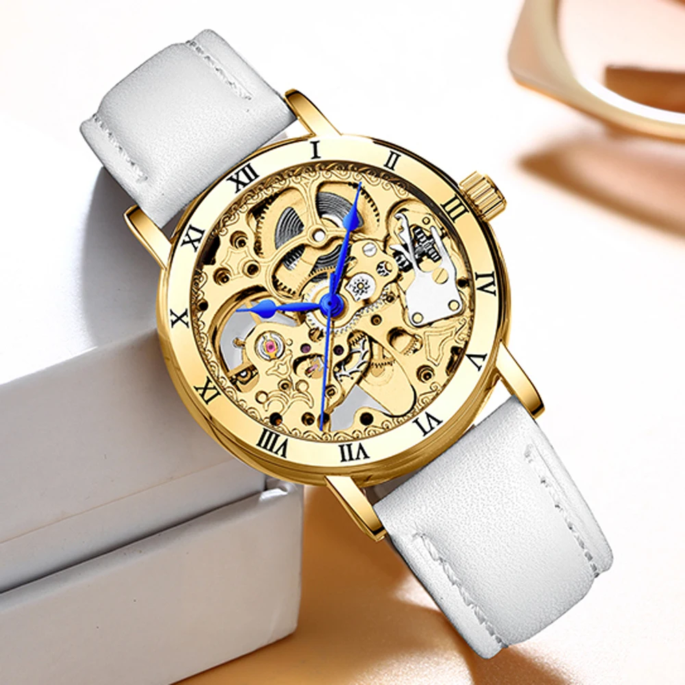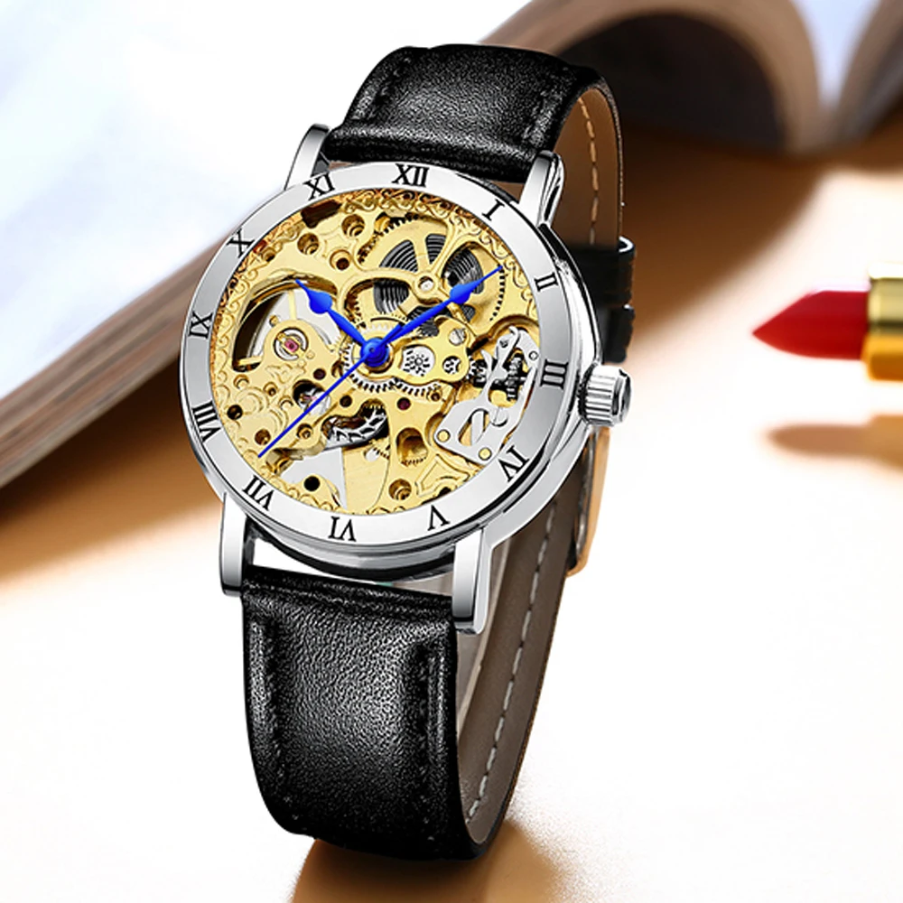 Часы наручные женские механические, модные автоматические золотистые наручные часы-скелетоны с римской рамкой, с автоподзаводом, под платье с кожаным ремешком