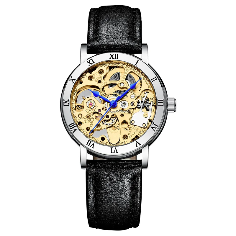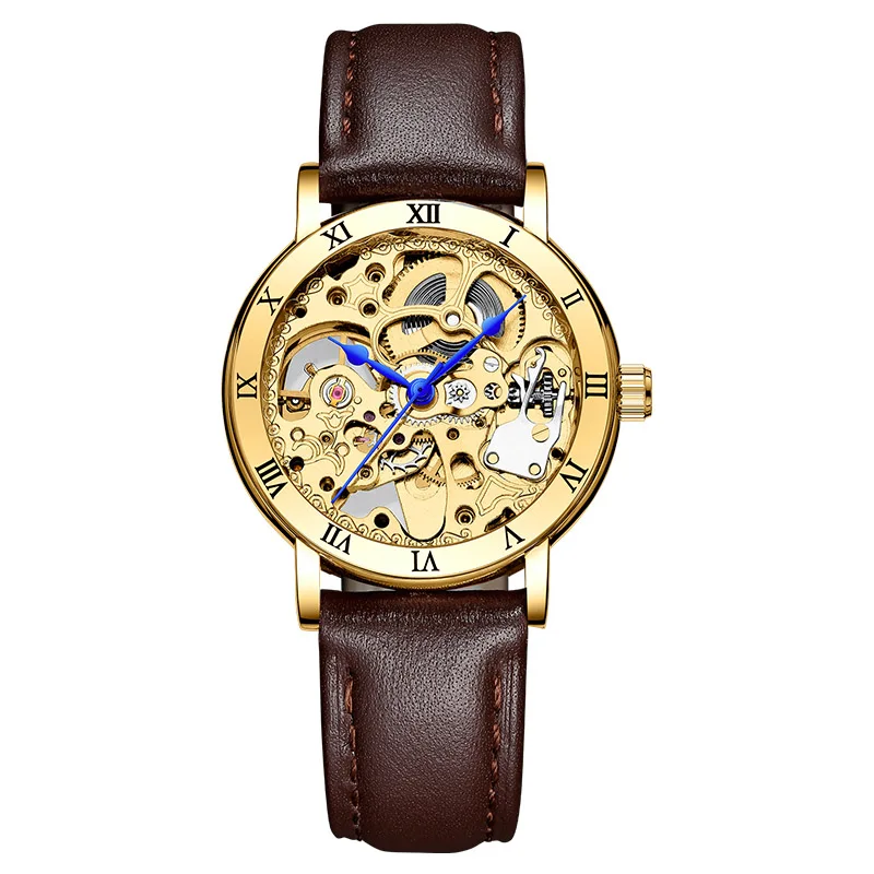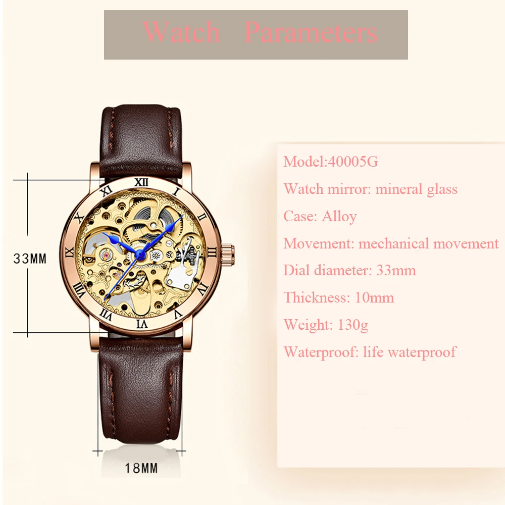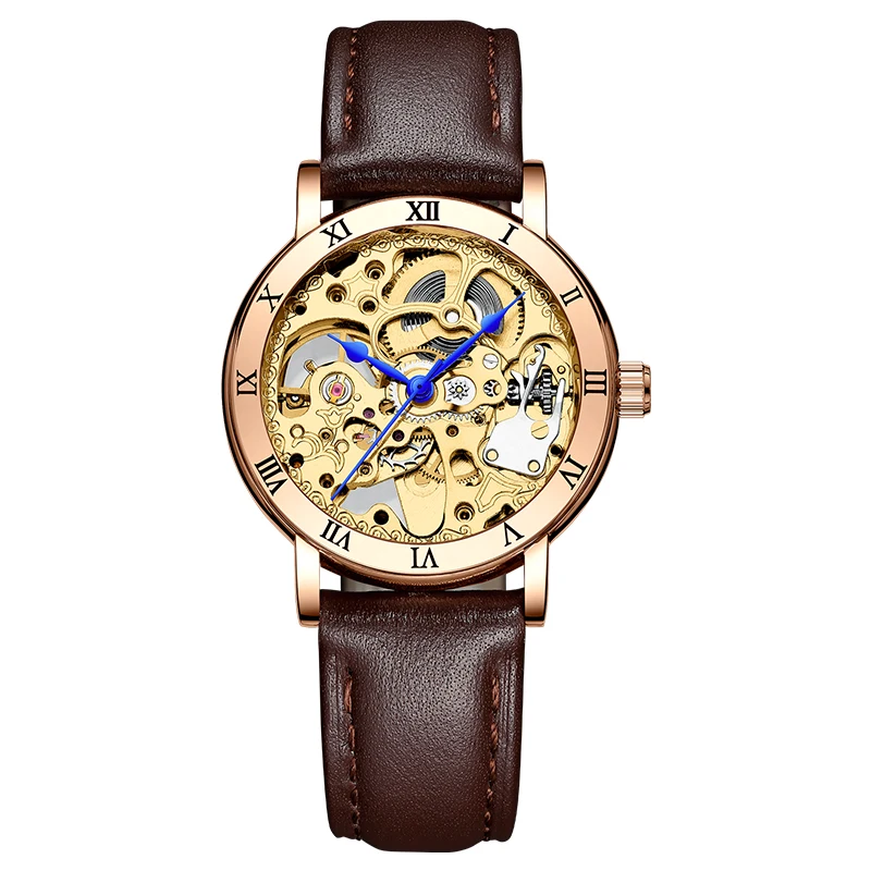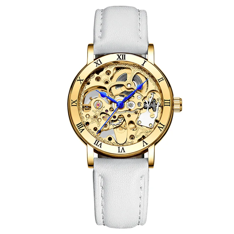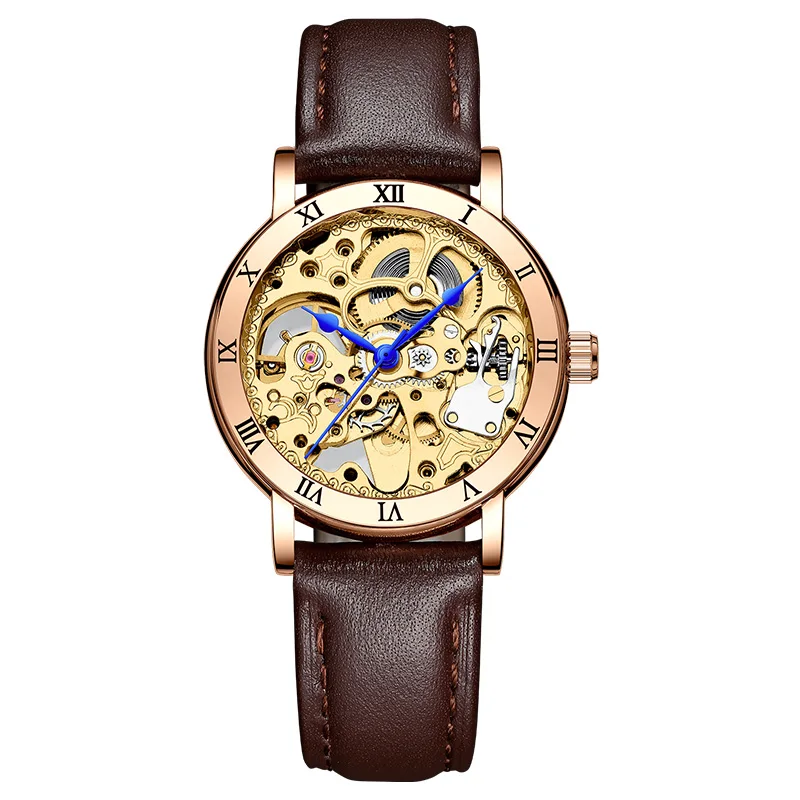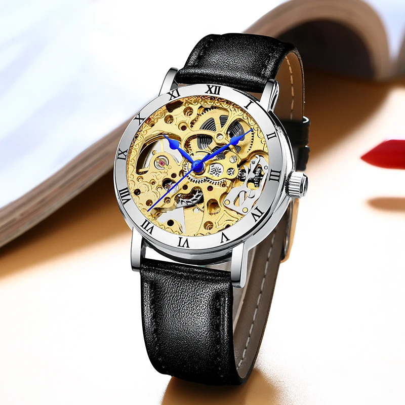 Часы наручные женские механические, модные автоматические золотистые наручные часы-скелетоны с римской рамкой, с автоподзаводом, под платье с кожаным ремешком