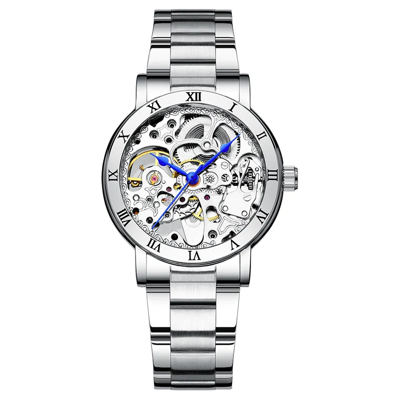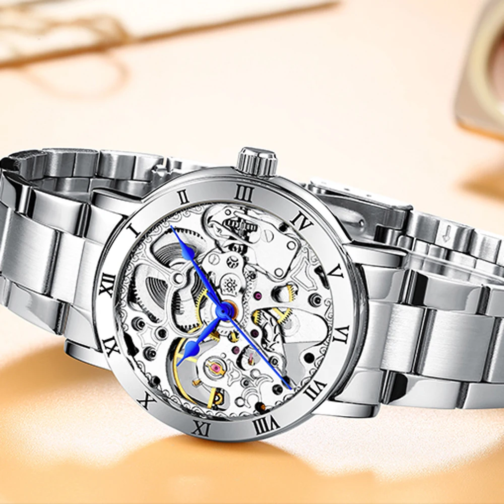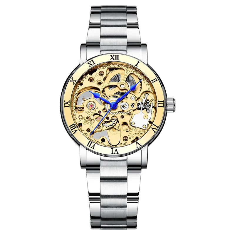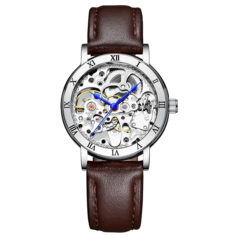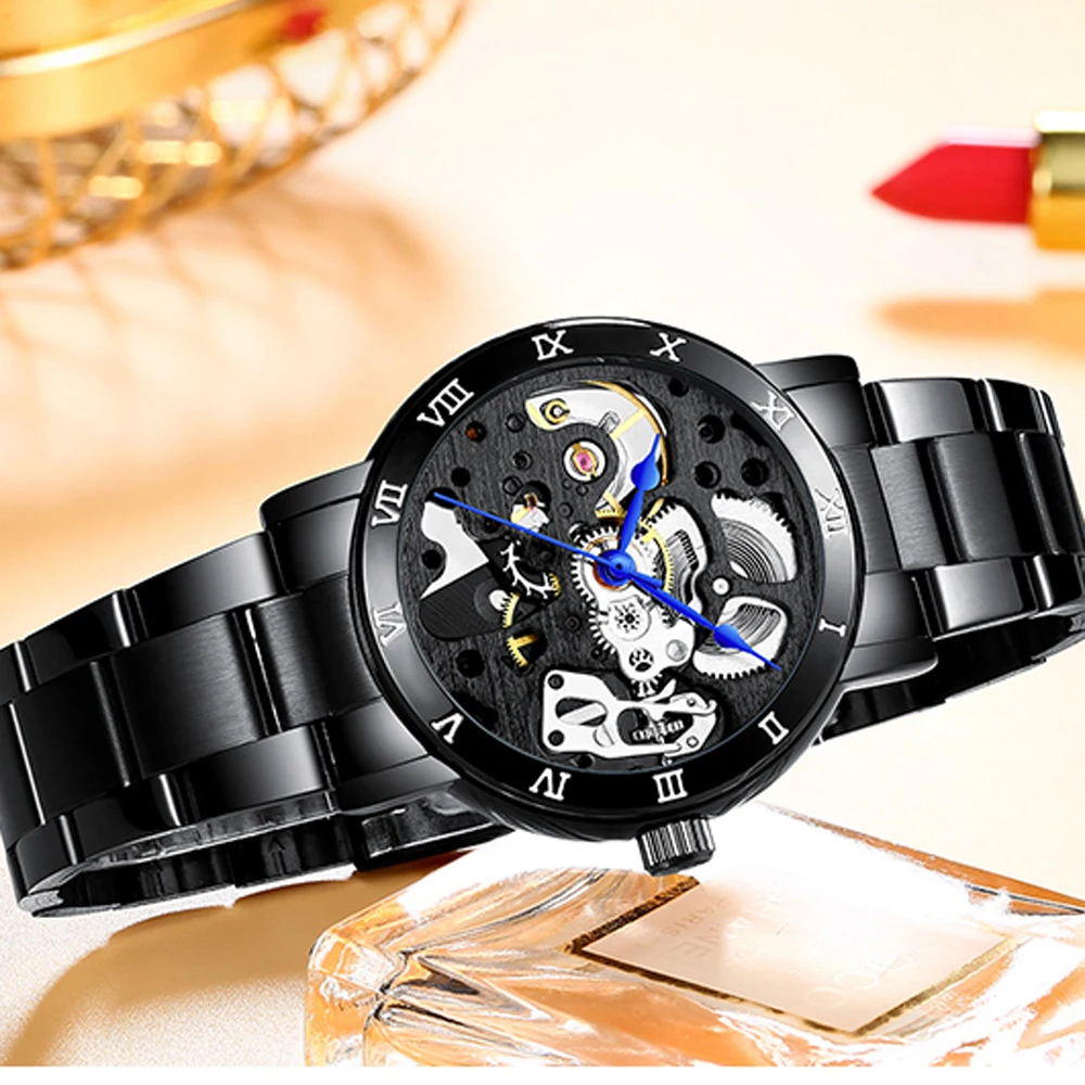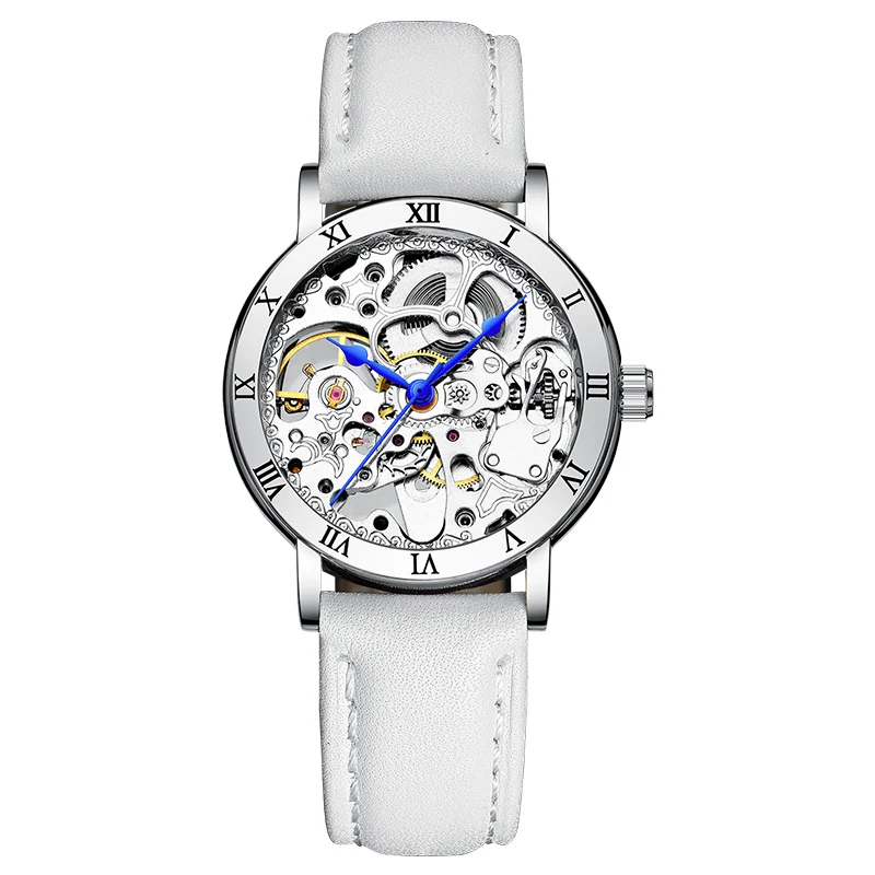 Часы наручные женские механические, модные автоматические золотистые наручные часы-скелетоны с римской рамкой, с автоподзаводом, под платье с кожаным ремешком