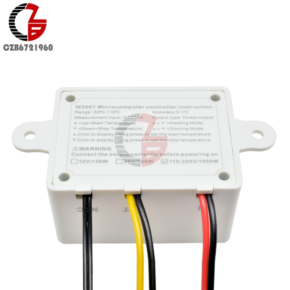 Особенности: Модель: XH-W3001 Название: регулятор температуры Измерение температуры, дисплей; охлаждение, контроль нагрева Температурная Настройка верхнего и нижнего пределов Простая работа, подходит для морепродуктов. Простота установки Спецификация: 1. Диапазон измерения:-50 °C ~ 110 °C 2. Диапазон управления:-50 °C ~ 110 °C 3. Точность измерения: плюс или минус 0,2 °C 4. Точность управления: плюс или минус 0,1 °C 5. Измерительный вход: NTC10K L = 1 м водонепроницаемый зонд 6. Мощность: 1500 Вт 7. Входное напряжение:AC 110 V 220 V/DC 12 V 24 V 8. Ток: макс. 10А 9. Размер: 60*45*30 мм Как использовать: 1. Нажмите кнопку вверх, чтобы показать начальную температуру Длительное нажатие кнопки вверх Отображение температуры мигает, нажмите кнопку вверх или вниз установите значение температуры начала 2. Нажмите кнопку вниз, чтобы показать температуру остановки Длинное нажатие кнопки вниз Отображение температуры мигает, нажмите кнопку вверх или вниз установите значение температуры стоп В комплект входит: 1 х светодиодный цифровой регулятор температуры 1 датчик NTC