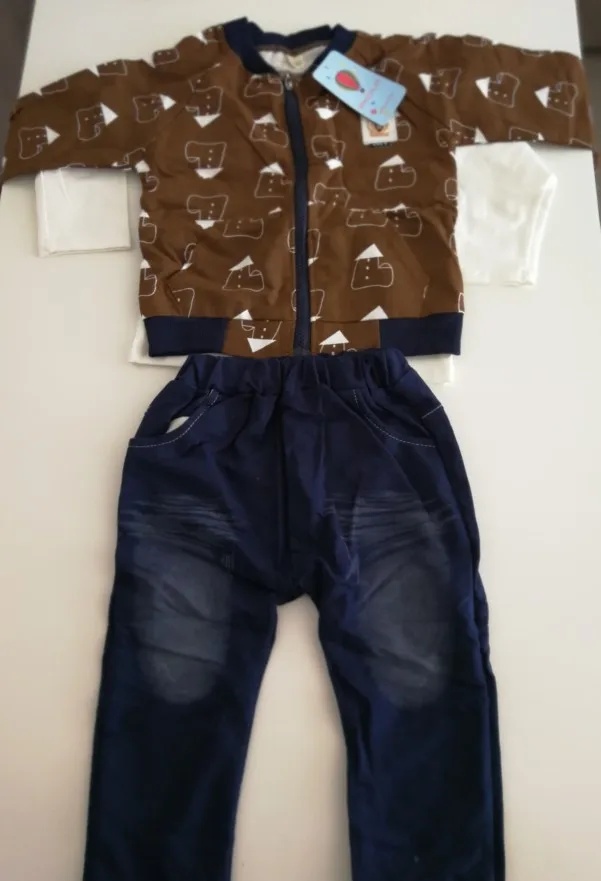 Неплохой костюмчик, заказывала на 2 года 3Т, из всех других костюмов этот самый большой, но описанию соответствует, действительно ближе к 3 годам. Штаны по принту под джинс, качество спортивных тянущихся штанов, вместо спортивок их носить, а вот верхняя кофточка очень понравилась, материал тонкий, но будто накрахмаленный, держит форму и действительно похож на верхнюю одежду, летний вариант, но выглядит достойно. До Москвы около месяца, трек отслеживался