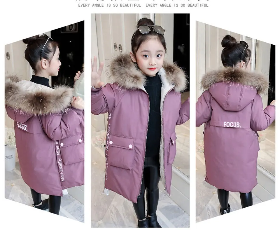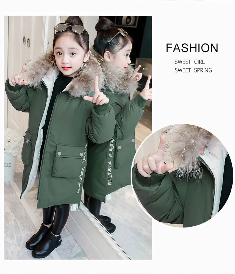 Модная детская зимняя пуховая хлопковая куртка, одежда для девочек, теплая плотная парка с меховым воротником и капюшоном, длинные пальто, От 4 до 12 лет, 2019