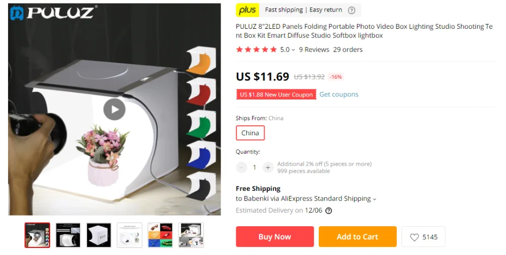 Заказал на 17/10; Получил на 23/10. Простота в использовании и настройке для фотографирования продуктов. Нравится эта портативная мини-студия. Не нужно было общаться с продавцом. Заказ был отправлен быстро. Заказ, который я разместил последний, но получил раньше, чем другие заказы. Хорошо обернута для защиты.