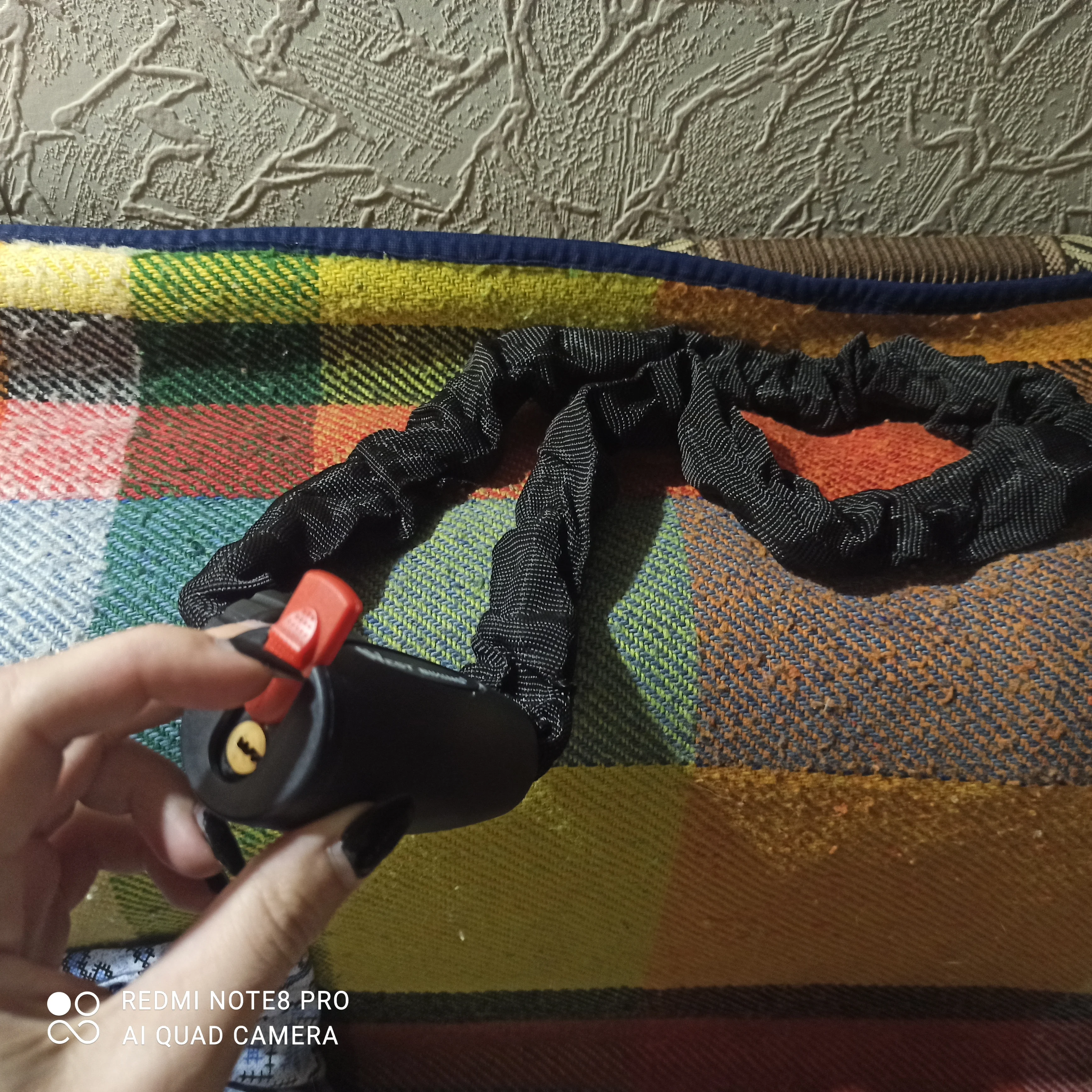 Доставка из Москвы 7 дней. Самый большой размер обошелся 1094.57р. Замок сделан из металла в чехле и пластике. Внутри металлическая цепь. Для сравнения на фото велозамок за 100р. из местного магазина. По ощущениям надёжная вещь. Однако дороговато. С продавцом не общался, не было необходимости