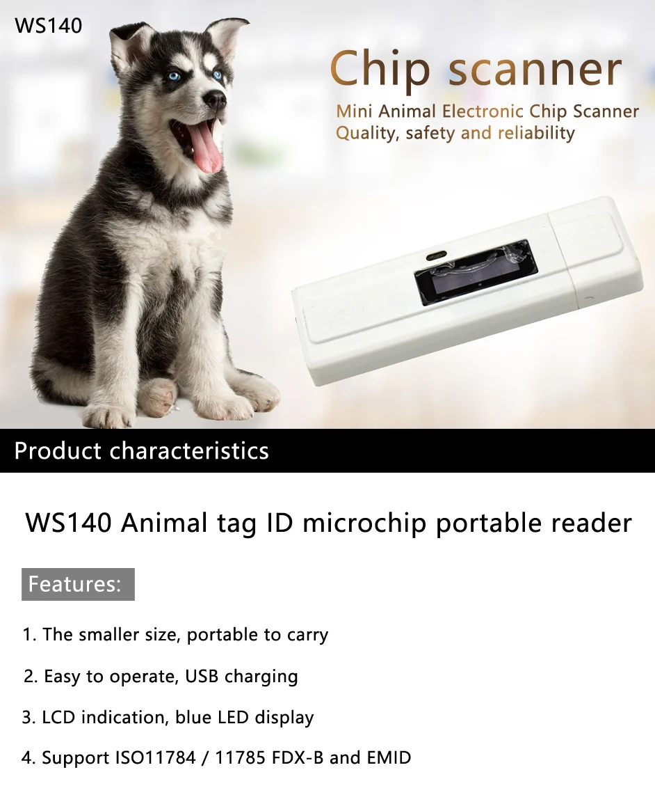 Особенности: 1 маленький размер и легко носить с собой; 2. Простота в эксплуатации, порт USB заряжается напрямую; 3 ЖК-дисплея, прозрачный и легко читаемый; 4 Поддержка стандарта ISO11784/11785 FDX-B и Предоставление доверия вашим потенциальным пользователям.