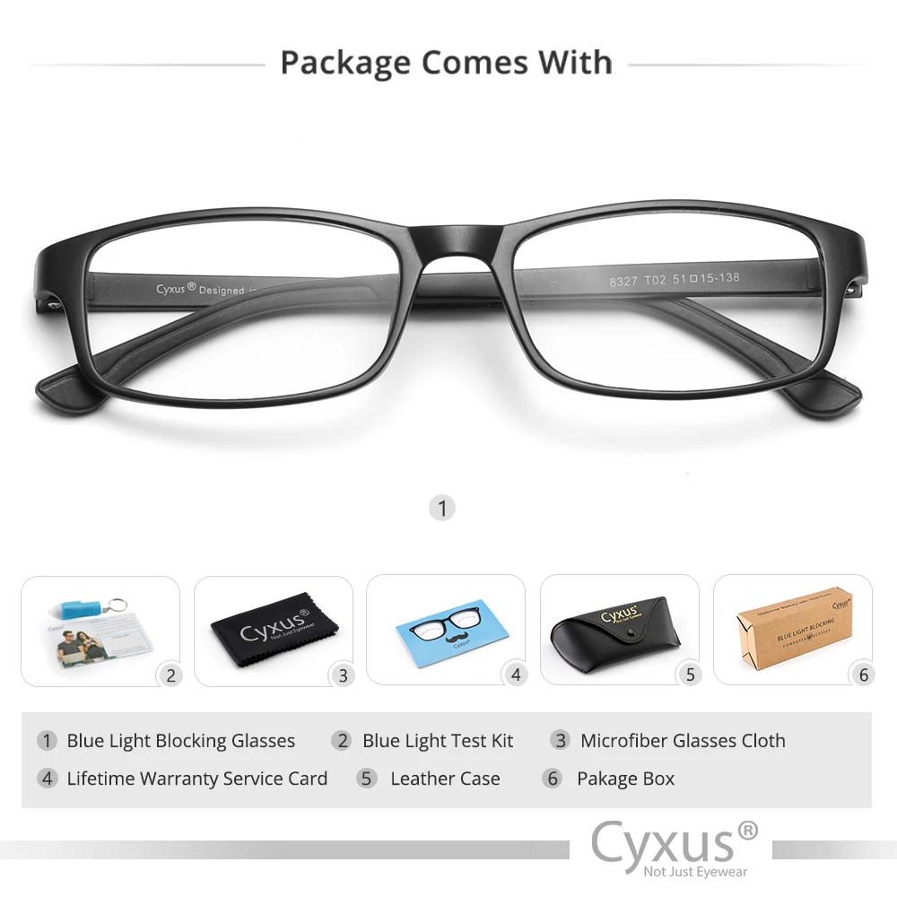 Cyxus-это профессиональный бренд очков для защиты глаз сFDAСертификация,CEСертификация,Тест RoHSSGS иТест шара паденияИЦИ. Cyxus — это не просто очки, это наибольший комфорт для зрения в цифровую эру.