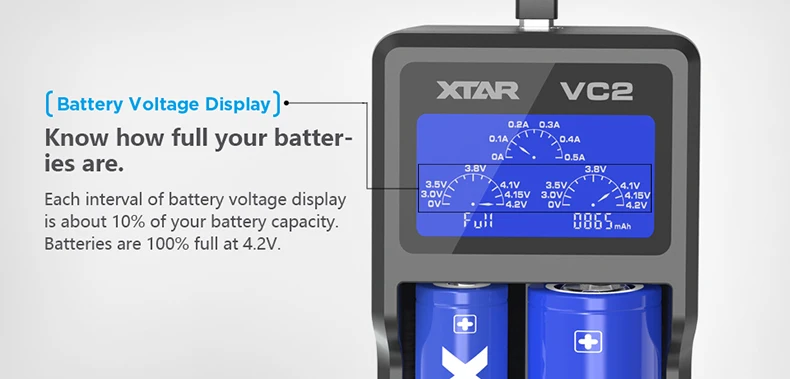 Хороший и полезный прибор XTAR VC2 включающий в себя и зарядку аккумуляторов и возможности узнать всю информацию об аккумуляторе такую как - зарядный ток, напряжение батареи, зарядная емкость. Возможность заряда АКБ разных размеров длинных или коротких, для отображения информации об батареи есть вверху окошко на зарядном устройстве XTAR. Так же есть возможность заказать usb адаптер с вилкой на выбор. В зависимости из какой вы страны. Товар доставлен быстро и я им очень рад, огромное спасибо продавцу.