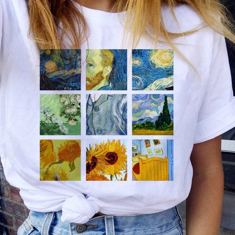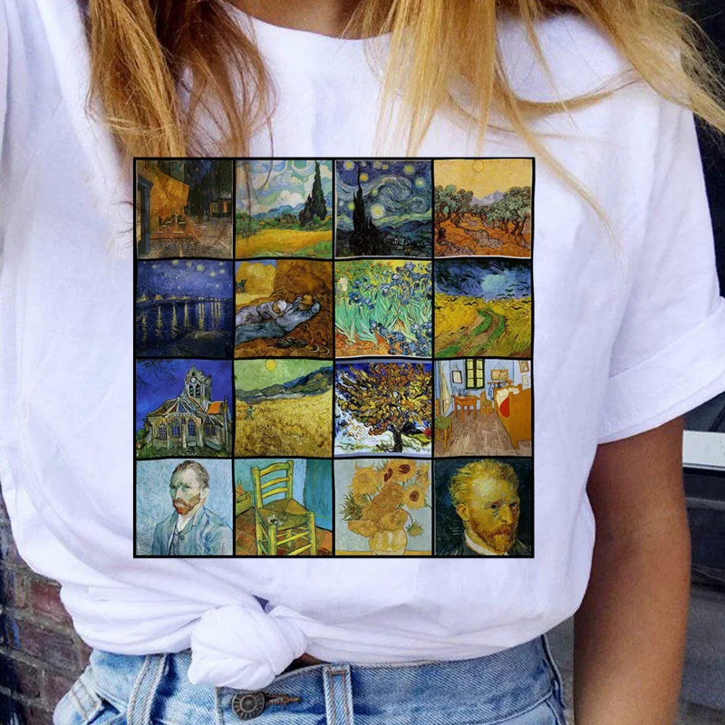 Женская футболка с забавным принтом Ван Гога, Винтажная футболка в стиле 90-х в стиле ульзан, женская футболка в стиле Харадзюку, модные топы в Корейском стиле
