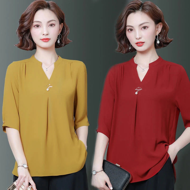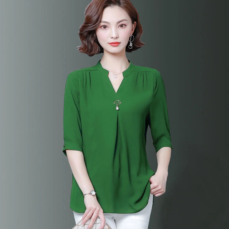 Женская шифоновая блузка, большого размера, с рукавом до локтя, V-образным вырезом, свободного покроя, весна-лето, DF2867, 5XL, женские блузки рубашки