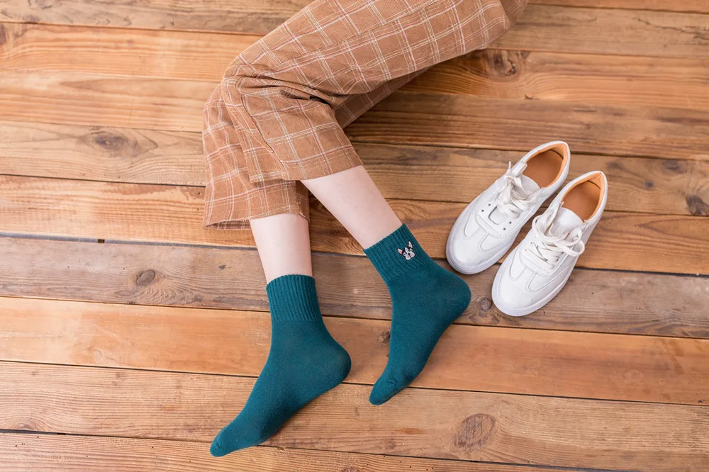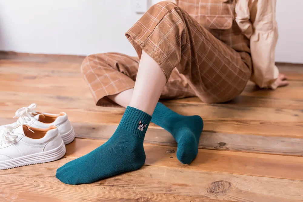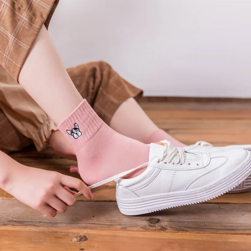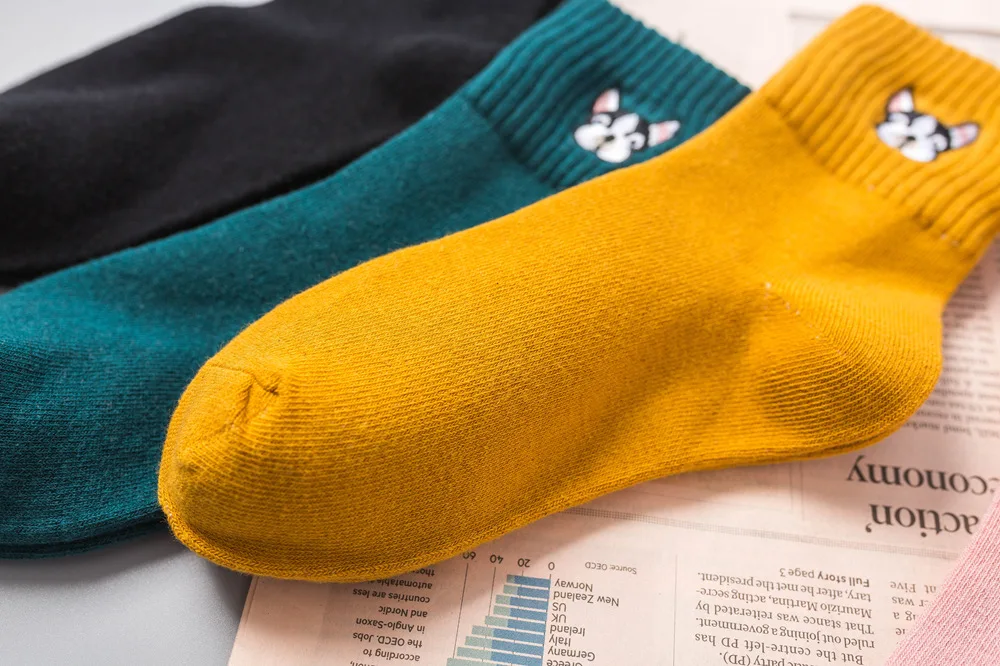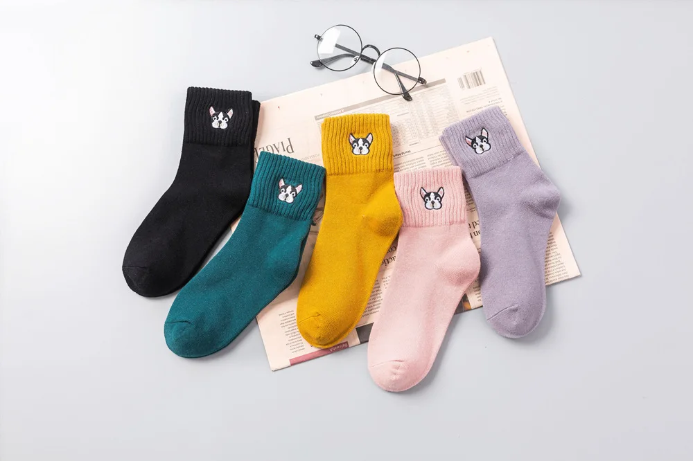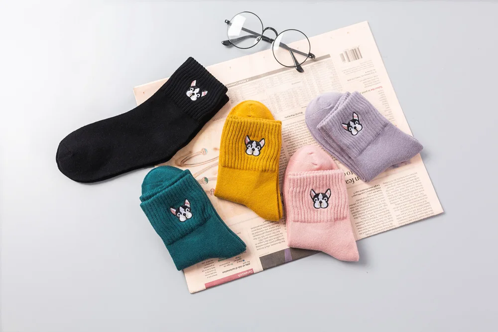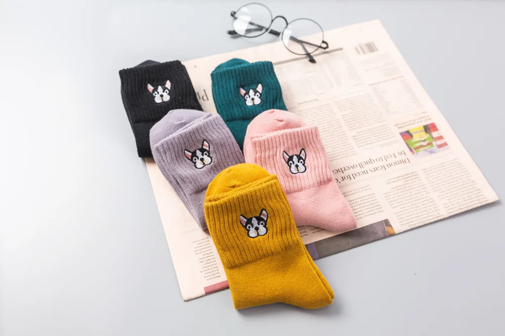 Носки для женщин, хлопковые носки с вышивкой французского бульдога, женские зимние толстые носки с мультяшным рисунком, женские повседневные милые носки, Прямая поставка
