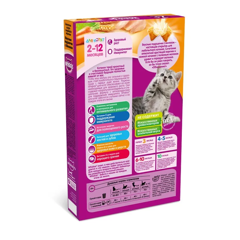 Это сбалансированный рацион для здоровой и счастливой жизни Вашего котенка. Хрустящие подушечки с молоком внутри обязательно придутся по вкусу Вашему любимимцу. Кроме того, рационы Whiskas® содержит все необходимое, чтобы еда Вашей кошки была не только вкусной, но и полезной.