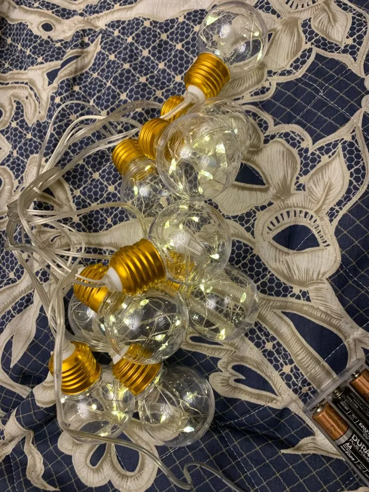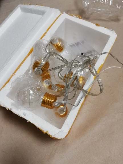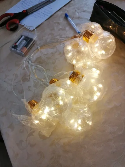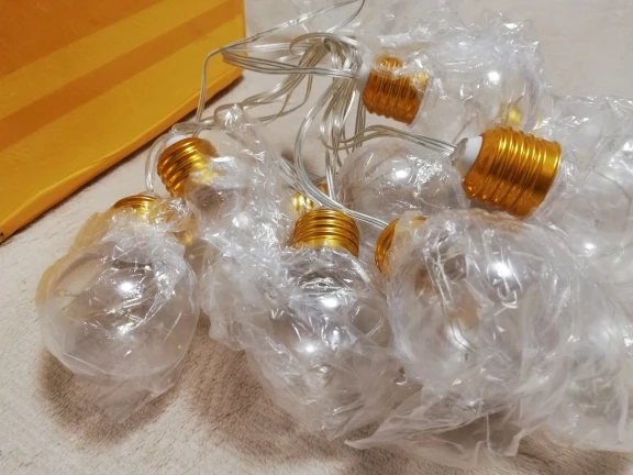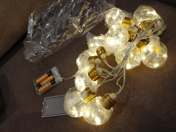 Чудесная гирлянда! Очень тщательная упаковка, каждая пластиковая лампочка упакована в индивидуальный пакет, чтобы не поцарапалась в пути. Вся гирлянда пришла в толстой пенопластовой коробке, тщательно замотанной скотчем. Имитация плафонов раскручивается. Все работает от трех стандартных батареек. Я бы заказала еще таких гирлянд