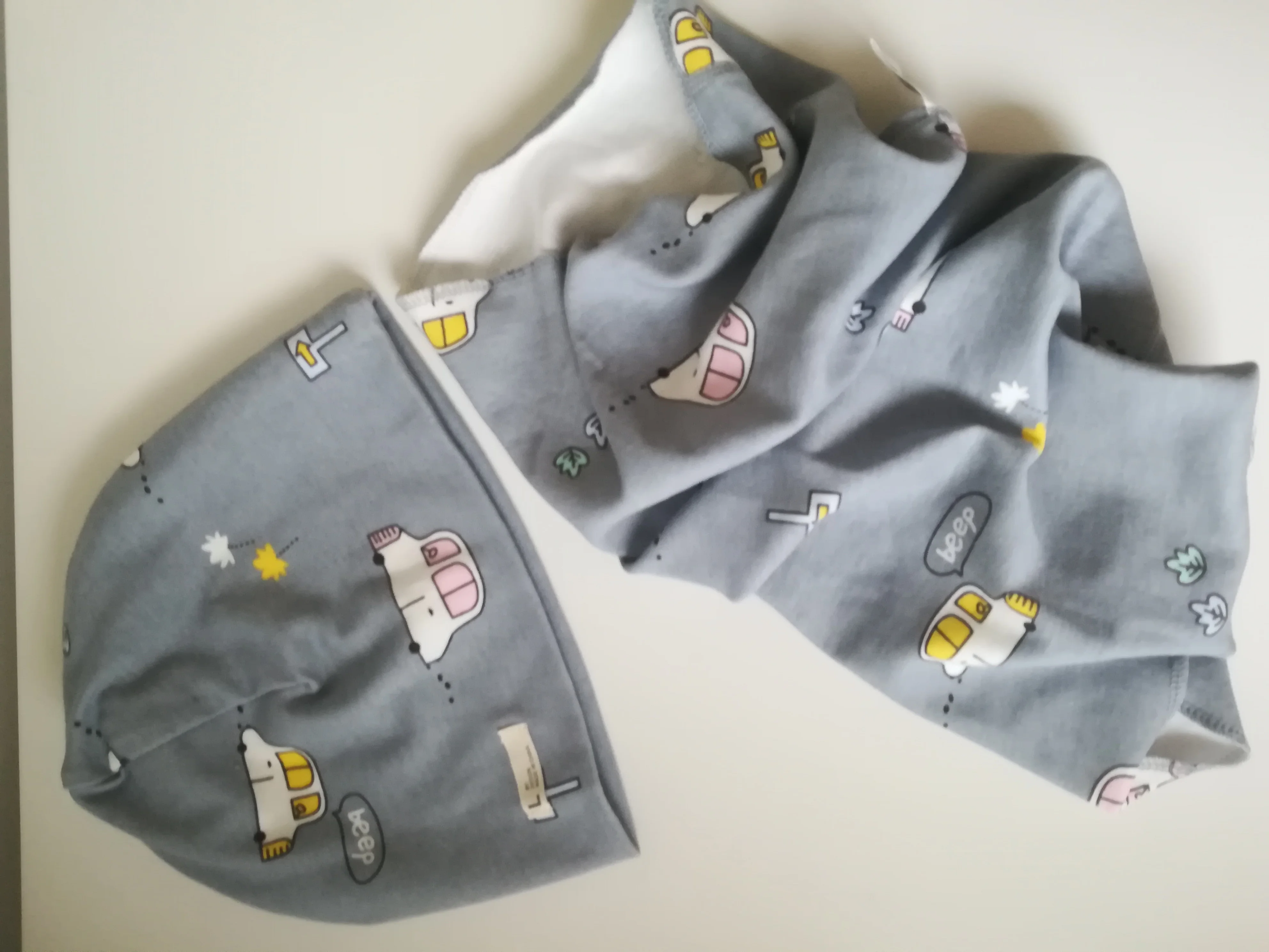 Заказаннвй размер 3-8лет только только на сына 4 года. Хлопок, приятный для кожи, сшито хорошо, шапка в два слоя. Заказывала два вида: полосатый и этот с машинками. Полосатый плотнее, тянется, трикотаж и даже больше размером на 4-5 лет, полойлет для прохладной осени весны. А этот к серый комплект с машинами более тонкий типа на сентябрь или апрель. Доставка быстрая 3 недели. Стоящий товар, берите, советую!!!!