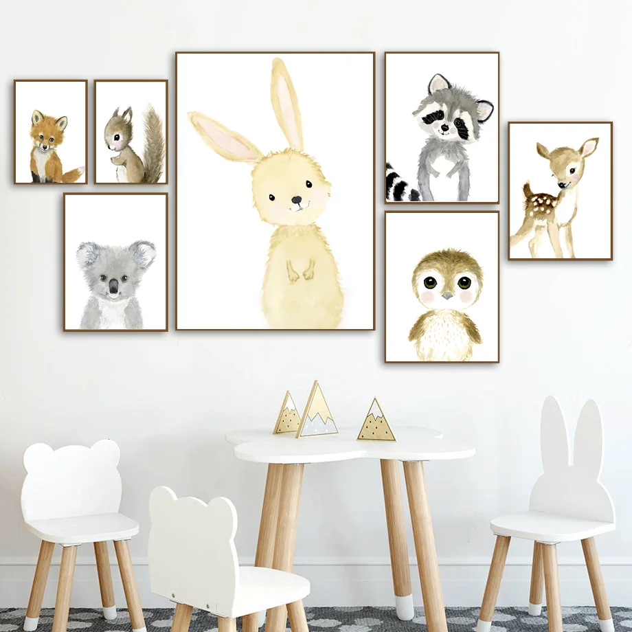 Акварель Медведь Кролик лиса собака мальчик девочка детская настенн...