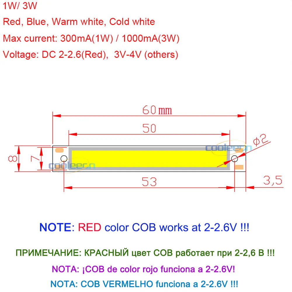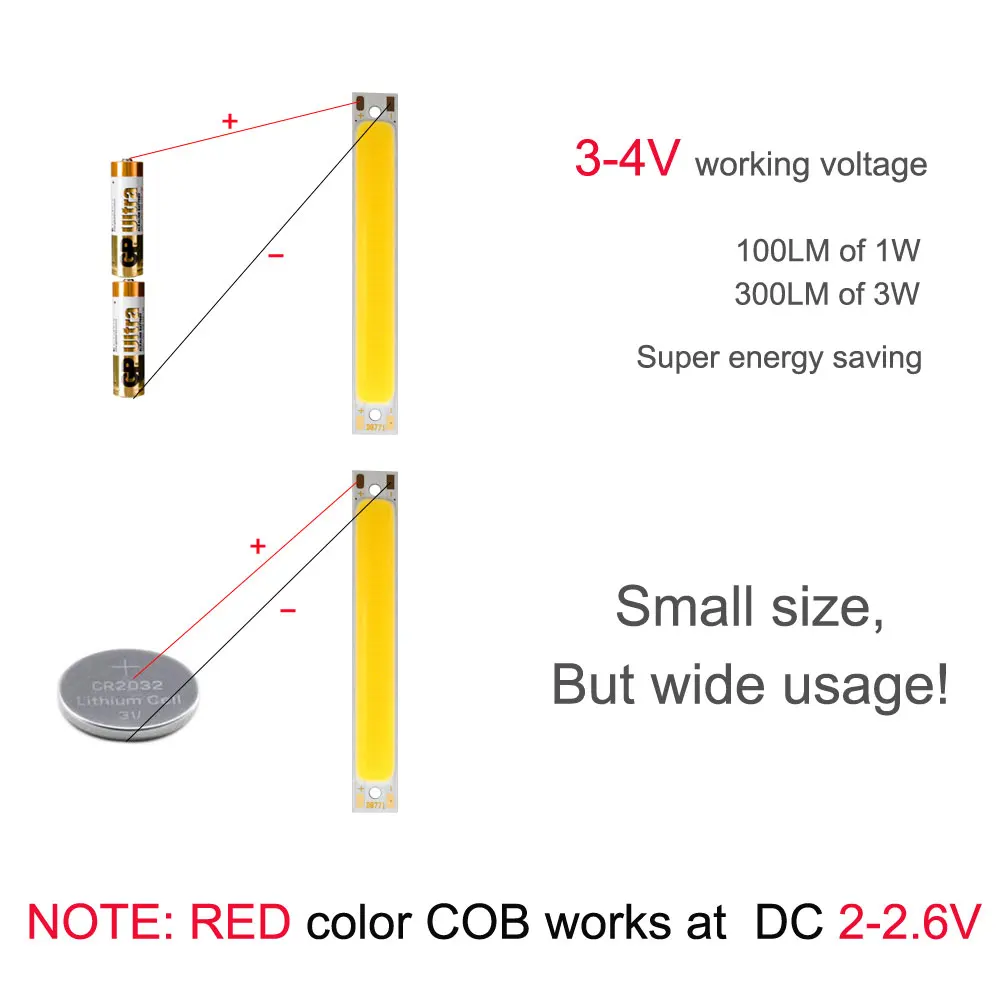 Дропшиппинг 60x8 мм 2V 3В светодиодный лампы COB светодиодный полосы 3,7 V бескорпусный чип теплый холодный белого и синего цвета красный Цвет 1 Вт 3 Вт светодиодный свет COB Рабочая лампа