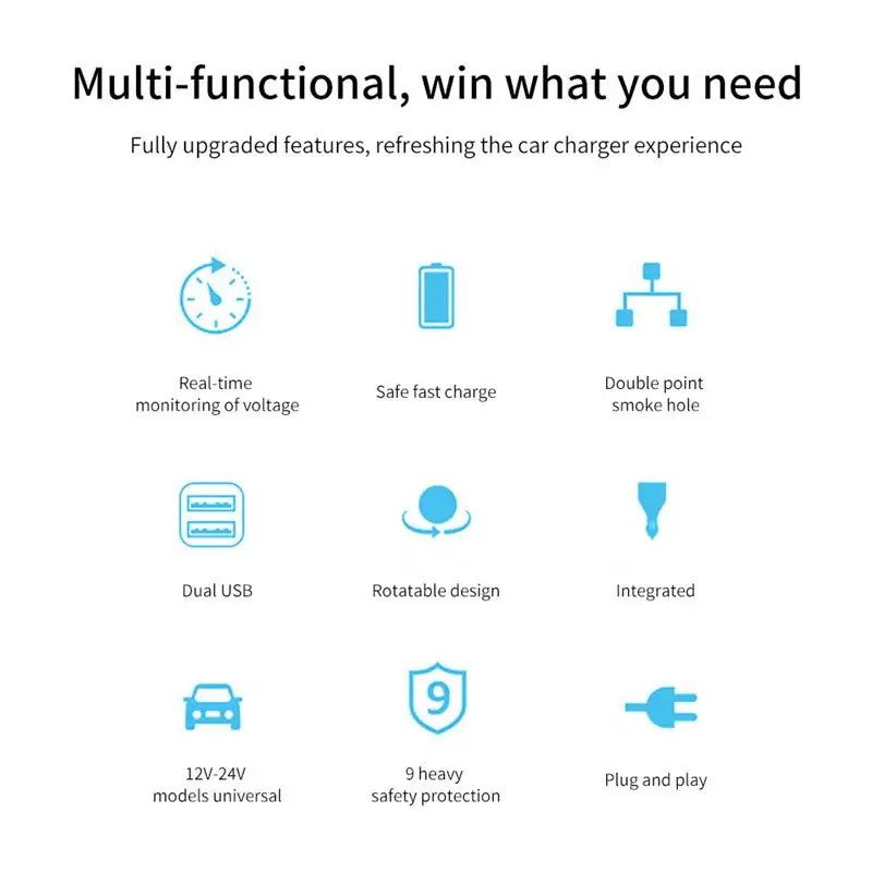 Особенности: Двойной USB кабель для зарядкиДвойной порт USB может поддерживать одновременную зарядку двух устройств, с одним портом USB 2,4 A макс. ток (всего 3,1 А). Интеллектуальная Быстрая зарядка может увеличить скорость зарядки 60% и сэкономить время зарядки 40%. Интеллектуальный чип может эффективно контролировать температуру, чтобы избежать высокой температуры. Двойной прикуривателя портыАвтомобильный сплиттер также имеет двойные порты прикуривателя, что удобно для пользователей для одновременной зарядки различных устройств. Напряжение дисплейЕсть экран для отображения напряжения аккумулятора автомобиля, защищающий ваше безопасное вождение. Пряжка из нержавеющей сталиПряжка из нержавеющей стали может эффективно зафиксировать зарядное устройство в порту питания стабильно, даже в неровной дороге. РоторныйАвтомобильное зарядное устройство может поворачиваться в диапазоне 110 градусов в соответствии с вашими потребностями. Удобно для пользователей регулировать подходящий угол. ЗащитаАвтомобильный сплиттер обеспечивает различную защиту, включая защиту от перенапряжения, защиту от низкого напряжения, электромагнитную защиту, защиту от обратной вставки, защиту от короткого замыкания, защиту от высоких температур, защиту от перегрузки и защиту от перегрузки по току. Сфера примененияАвтомобильное зарядное устройство, которое относится к напряжению 12-24 В, совместимо с большинством транспортных средств, включая автомобиль, грузовик, внедорожные транспортные средства и так далее. Параметры:Тип: прикуривателяКоличество: купальное полотенце, 1 штМатериал: ABS + PC + электрический компонентЦвет: черныйВход: 12-24 ВОбщий выход USB: 5V3.1A MAXДвойная Зажигалка Общая мощность: 120 ВтРазмер: 123*80 мм/4,83*3,14 ''(Д * В) Посылка:1 * прикуривателя
