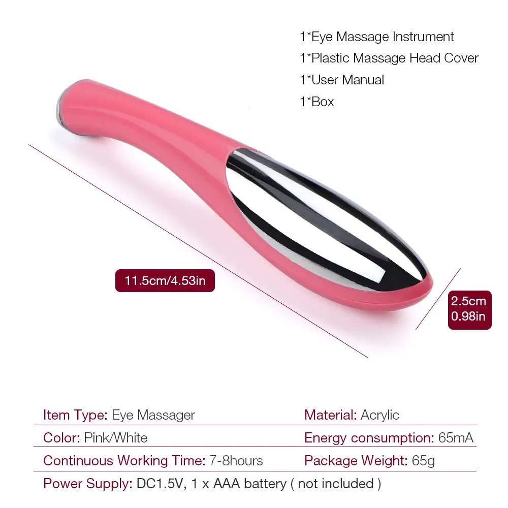 Электрический массажер для глаз, расслабляющий для красоты, средство против старения, морщин, темных кругов, пластырей, устройство для ухода за глазамиПараметрыТип изделия: массажер для глазМатериал: акрилЦвет: розовый/белыйПотребление энергии: 65маНепрерывное время работы: 7-8 часовИсточник питания: DC1.5V, 1 x AAA батарея (не включена)Вес посылка: 65 гРазмеры: 11,50x2,50x2,00 см/4,53x0,98x0,79 дюйм (ов)Продукт включает в себя1 * прибор для массажа глаз1 * Пластиковая крышка массажной головки1 * Руководство пользователя1 * коробка