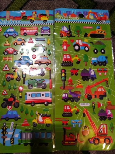 наклейки яркие как и на фото продавца, брали для ребенка как большого любителя транспорта, ему понравилось и это главное