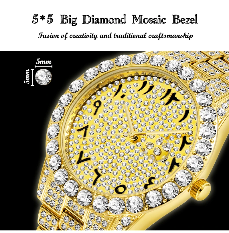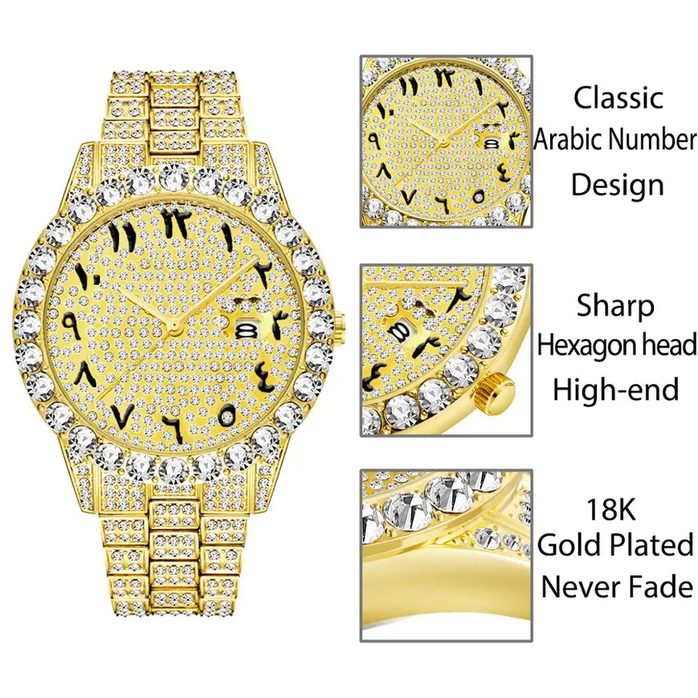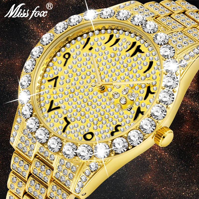 MISSFOX, мужские часы с арабскими цифрами, Топ бренд, роскошные часы для мужчин, 18 К золото, большой бриллиант, с канлендером, Классические мужские часы Iced Out