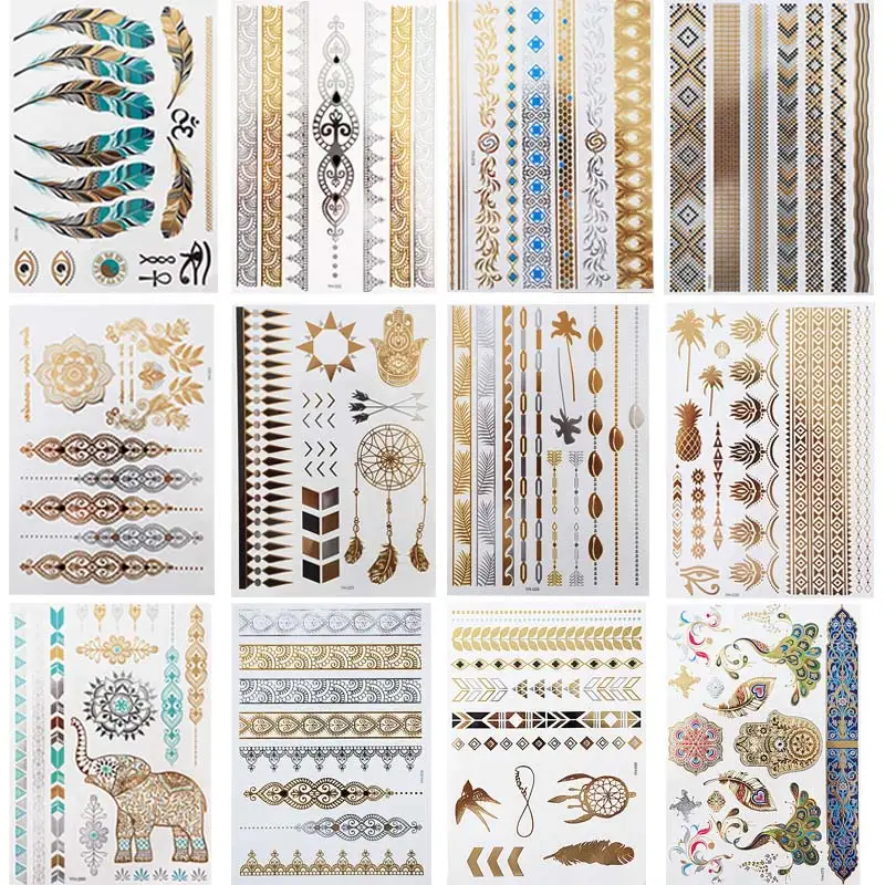 12 листов, металлические Временные татуировки, золотые, в стиле бохо, водостойкие, флэш, поддельные татуировки, дизайнерские наклейки для женщин и девочек