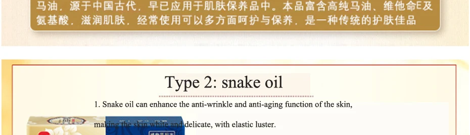 2. Может устранить морщины на лице и растяжки при беременности после беременности.3. Змеиное масло хорошо заживляет огонь, воду, ожоги и геморрой, вызванные длительным постельным отдыхом.4. Змеиное масло может предотвратить и лечить обморожение, особенно при трудноразрешимом обморожении.5. Часть тела сухой зимней рукой и разрывом стопы, кожа вернется