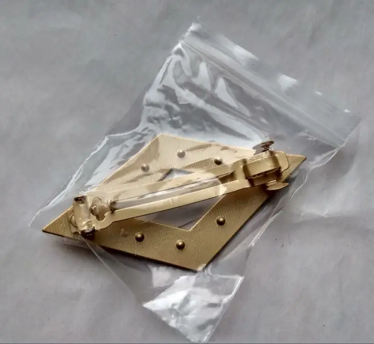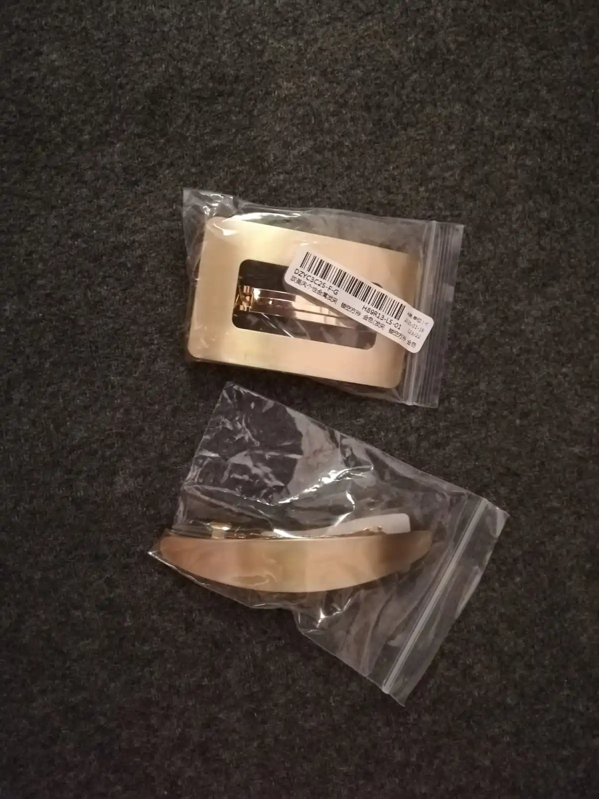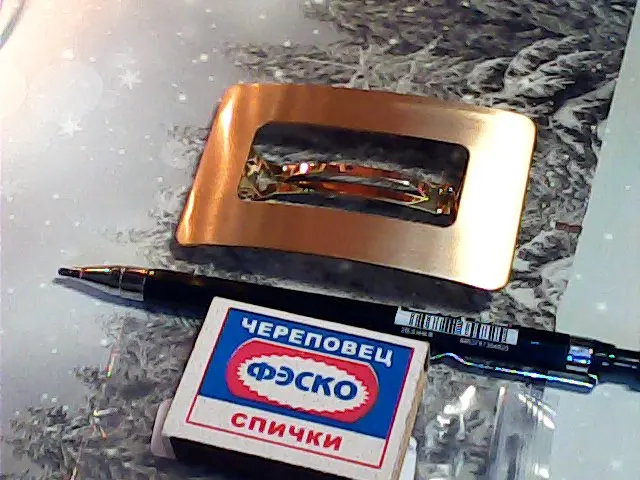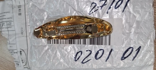 Полтора месяца до Москвы в общей посылке. Упакована в пупырчатый пакет, дошла в целости. 8х4,4 см. Не золотая, а светло-бежевая, такая матовая эмаль. Покрыта декоративными царапками, есть одна большая царапина - скорее всего погрешность печатной формы, портит впечатление. Волосы держит хорошо, но и замочек, и защелка слегка поворачиваются вокруг своей оси, из-за чего неудобно защелкивать и отдельные волосы могут зацепиться.