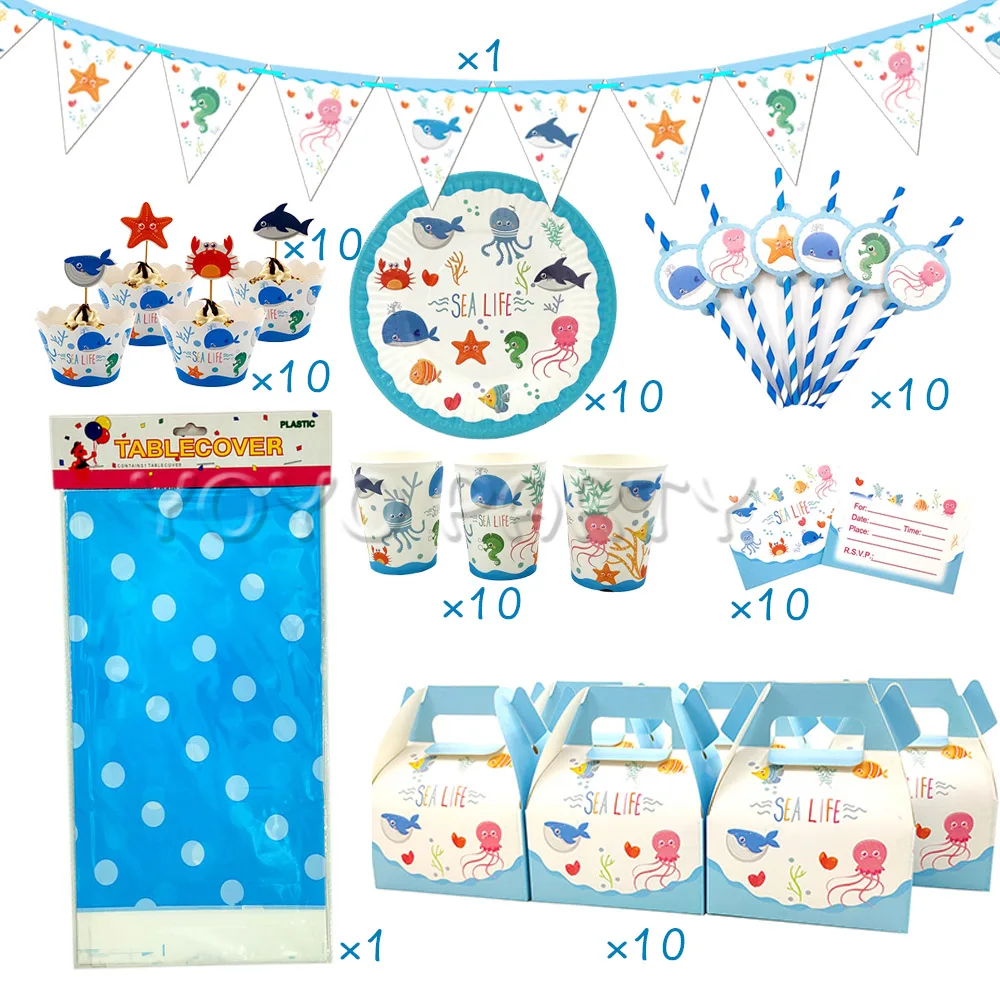 72 шт. для 10 детей морские животные тематические праздничные товары для дня рождения набор посуды, тарелка + солома + стекло + коробка + приглашения и т. Д.