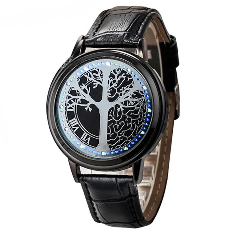 Часы мужские светодиодные с сенсорным экраном, модные простые, с рисунком дерева, с черным циферблатом и синим светом 60