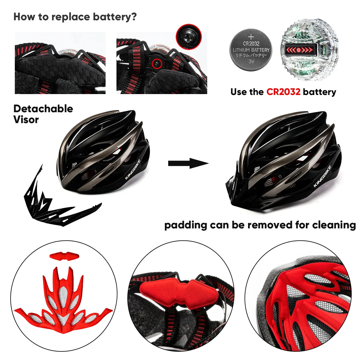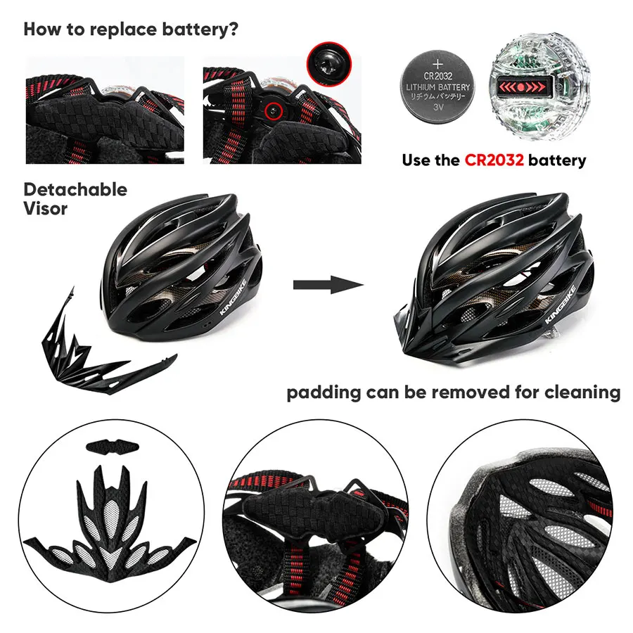 Бренд: KINGBIKEНазвание продукта: велосипедный шлем/велосипедный шлемМатериал: Поликарбонат + EPS + регулируемые поля.Размер: L56-60CMВес (г): около 210 гВентиляционные отверстия: > 20Номер модели: J-872Цвет: розовый, красный, синий, зеленый, фиолетовыйВозрастная группа: (взрослые) мужские велосипедные шлемыСцена: подходит для шоссейных и горных велосипедовСертификация: прошел сертификацию CE EN1078. Прошел тест безопасности.Тип: цельнолитой, Сверхлегкий, наружная защита для шлема MTB, шлем, козырек светильник шлемРекомендации по хранению:Не хранить во влажной среде, рядом с источником тепла или прясветильник Том, шлем для сухой обработкиПримечание:Этот шлем имеет функцию заднего фонаря, но в комплект не входит батарея (CR2032). Если вы хотите использовать функцию заднего фонаря, пожалуйста, купите аккумулятор в розничном магазине или супермаркете.